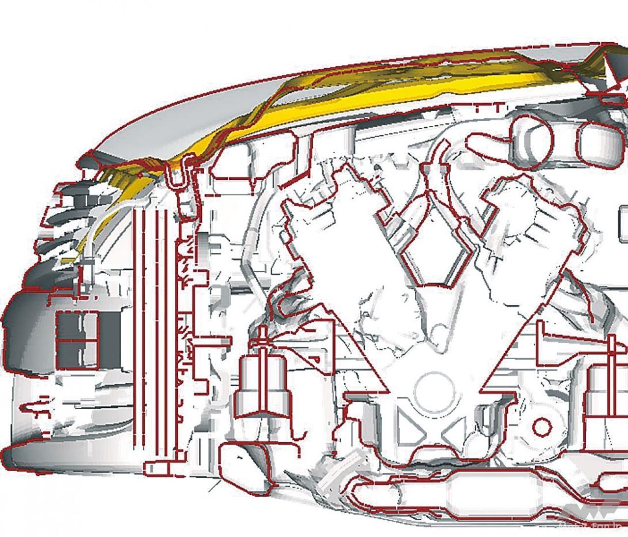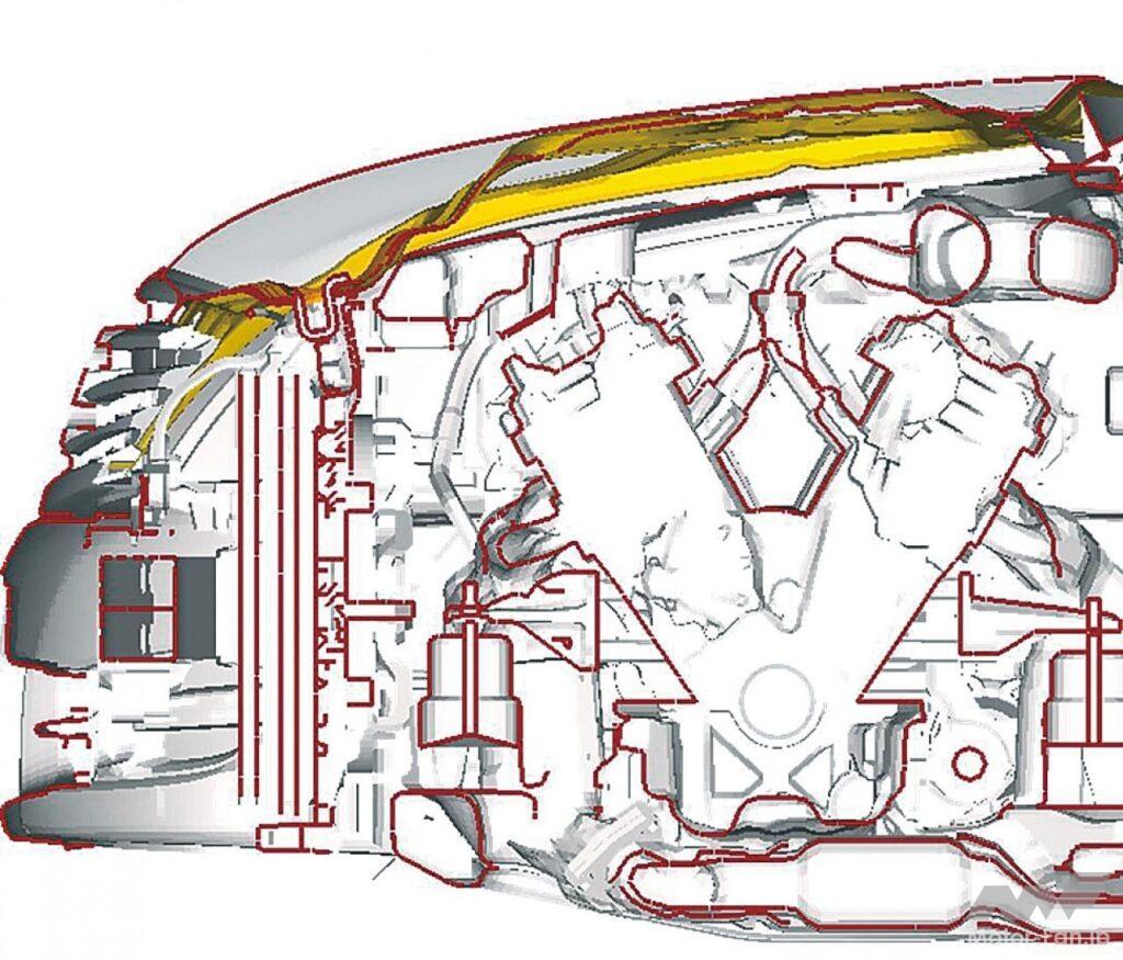 エンジンを下げれば車両重心が下がり、同時にフロントサイドメンバーを直線化することができた。エンジン上部には空間が生まれ、歩行者保護にも熱対策面でも有利になった。車両パッケージングの細かな詰めがいかに重要かを物語る開発事例だと言える。