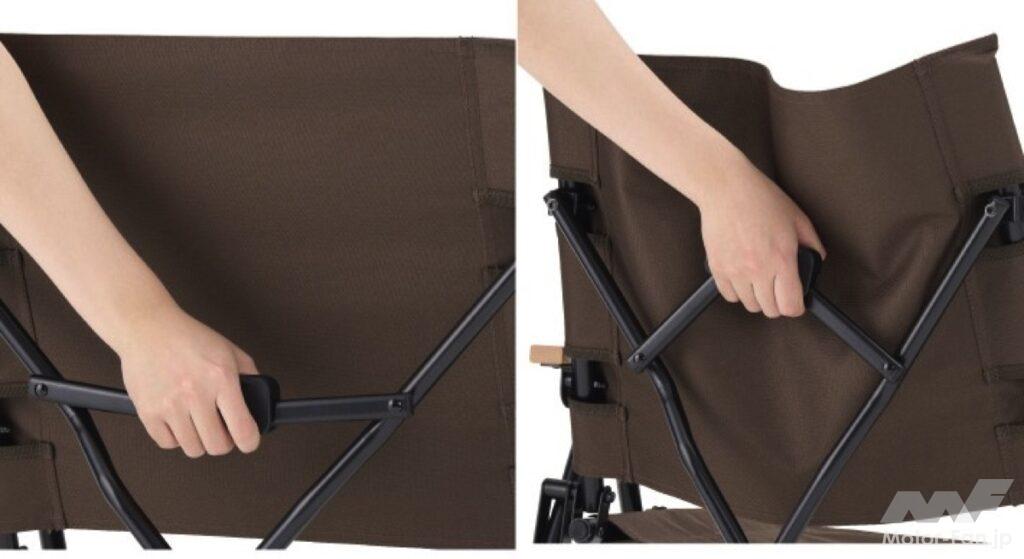 「ツーリングライトチェア」は折りたたみ式の収束構造を採用しており、設営・撤収が非常にスムーズ。使いたいときにはサッと広げてすぐに座ることができ、撤収時もあっという間に折りたたんで収納袋に収められる。このシンプルな操作性は荷物の多いバイクツーリングにおいて大きな強みになる。