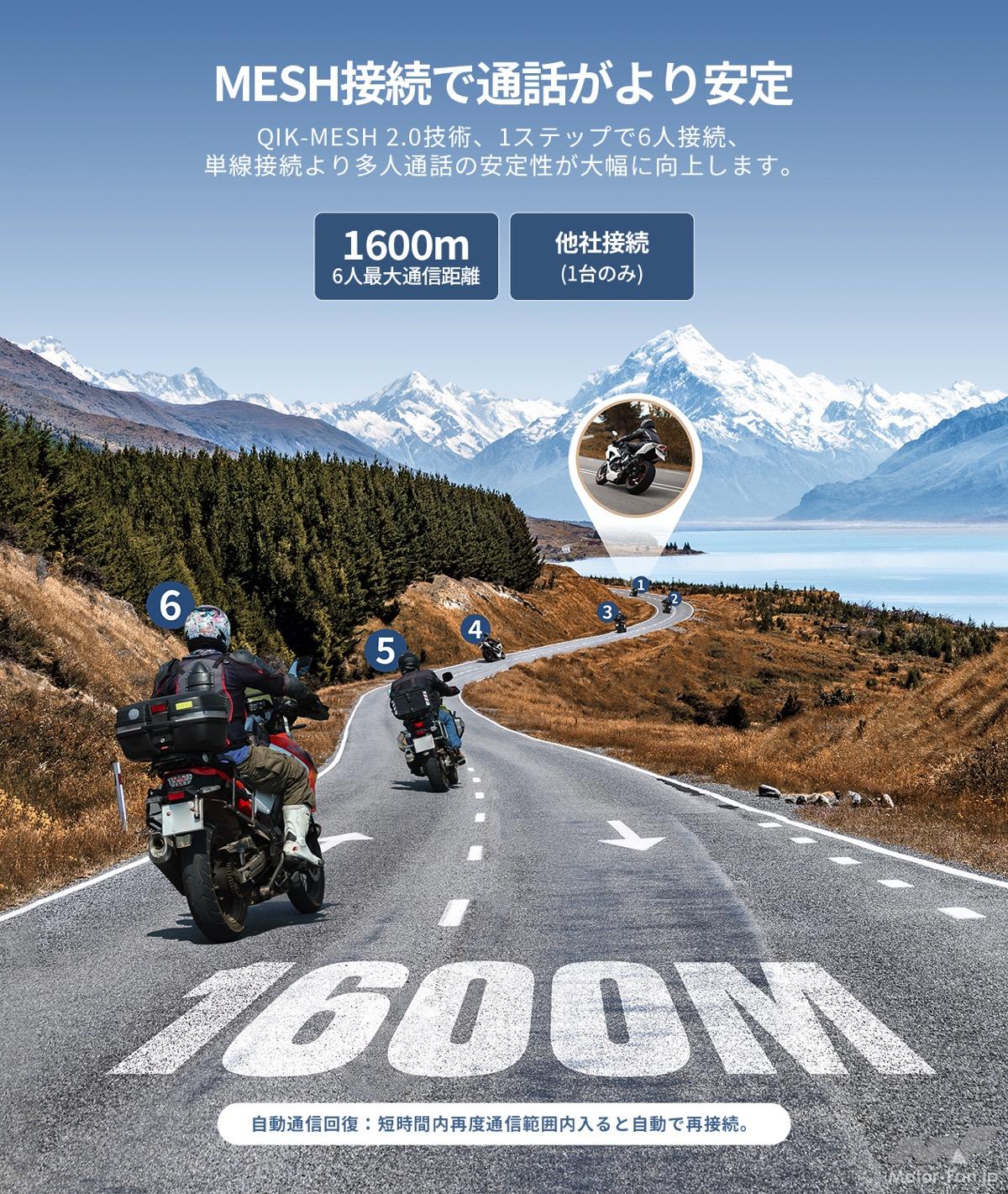 「H6」はJESIMAIK独自の通信技術QIK-MESH 2.0を搭載し、従来のバイク用メッシュインカムの課題を一気に解消した。複雑なチャンネル設定を排除し、ワンタッチペアリングで簡単に最大6人までの同時通話が可能。誰かが途中で通信を離脱しても、残りのメンバー同士の通話は途切れず継続されるため、ツーリング中のルート確認や休憩の打ち合わせもストレスなく行える。