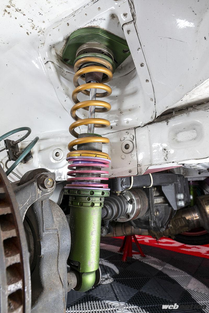 車高調は同郷の326パワーからのサポートを受け、チャクリキダンパーの減衰セットを自分好みにオーダーした特注仕様を装着。現在は、傾向として縮み側の減衰が硬めのセッティングを選んで使用しているようだ。