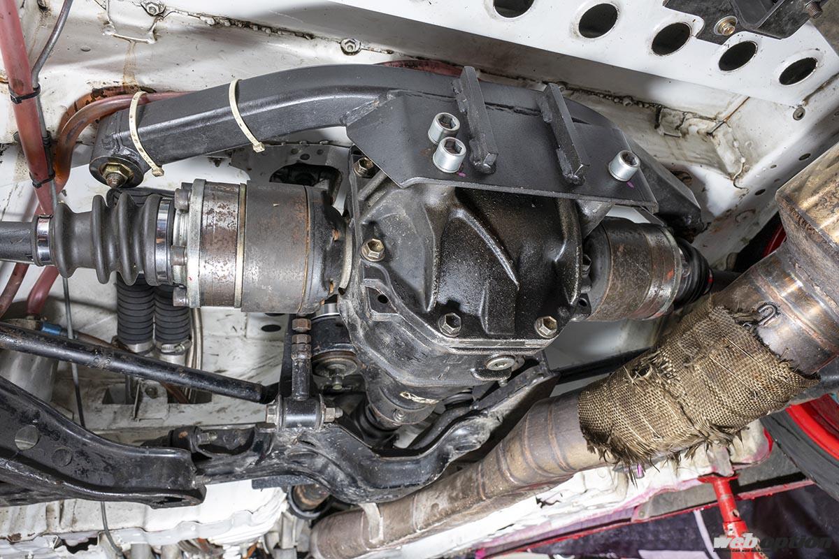 デフはFC用よりも強度の高いトヨタ8インチケースをメンバー側のマウントをワンオフして装着。ドライブシャフトプロのFC3S用ドラシャを使い、全長はスペーサーによって解決する仕組みだ。