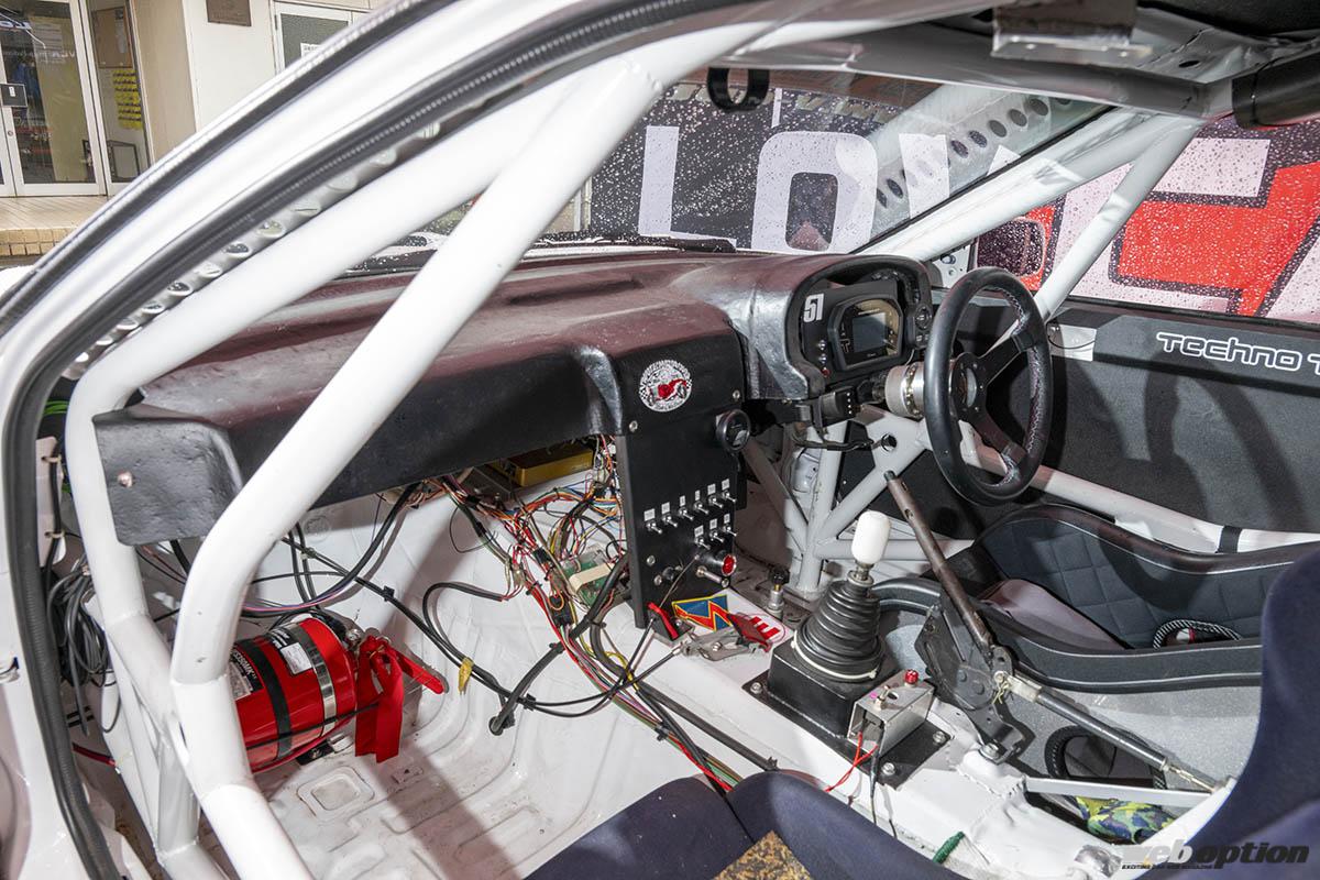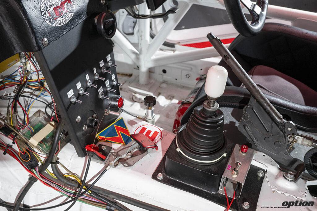 ダッシュボードは、軽量化のために純正同形状のFRP仕様をワンオフメイド。HKS6速ドグミッションはHパターンかつ重量もあるが予算を最優先した結果だ。サイドブレーキはシルビアのレバーを移植し、助手席側から運転席側へ引きやすいよう位置を変更済み。