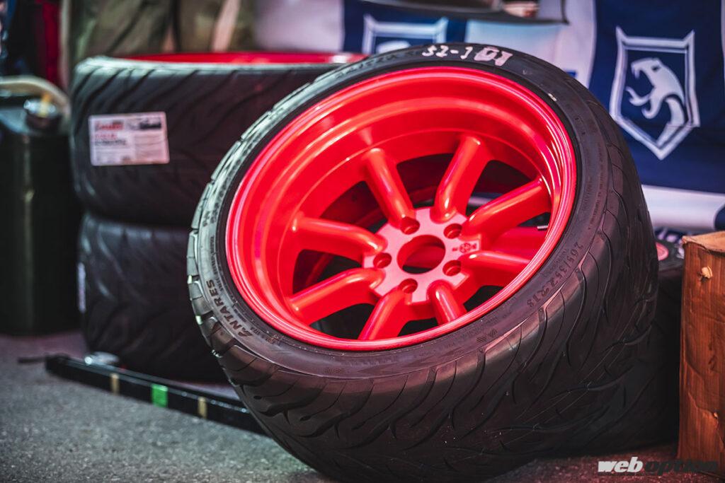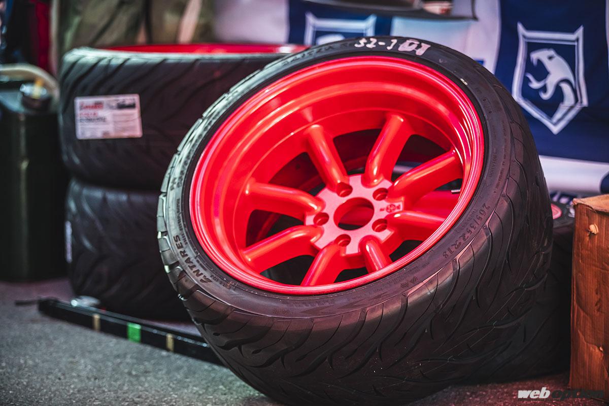 FC3S乗り替えのキッカケにもなったパンデムのボディキットを外装にまとい、足元にはスポンサードを受ける前からずっと選び続けてきた赤いワタナベの8スポークRタイプを履く。フロントはスペーサーレス、リヤは性能面ではなくキャリパーをかわすのとツラを出すためのワイトレ25mmが入っている。