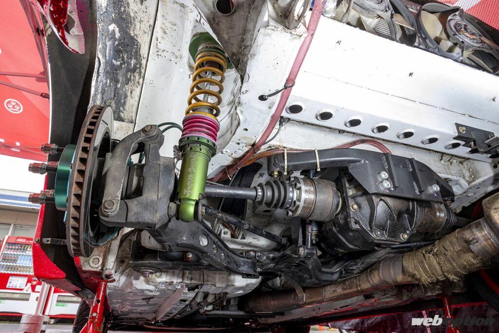 リヤのアライメントは、ドライブシャフトの前でサスメンバーを上下に吊るキャンバーリンクでの調整と、フロント側でナックルに繋がるトーコントロールアームと偏心カムで行なう。いずれも調整式は使わず、溶接による全長調整である程度の数値を決め打ちした状態でテストに挑んでいるが、調整幅の少なさに苦労する場面も多いそう。