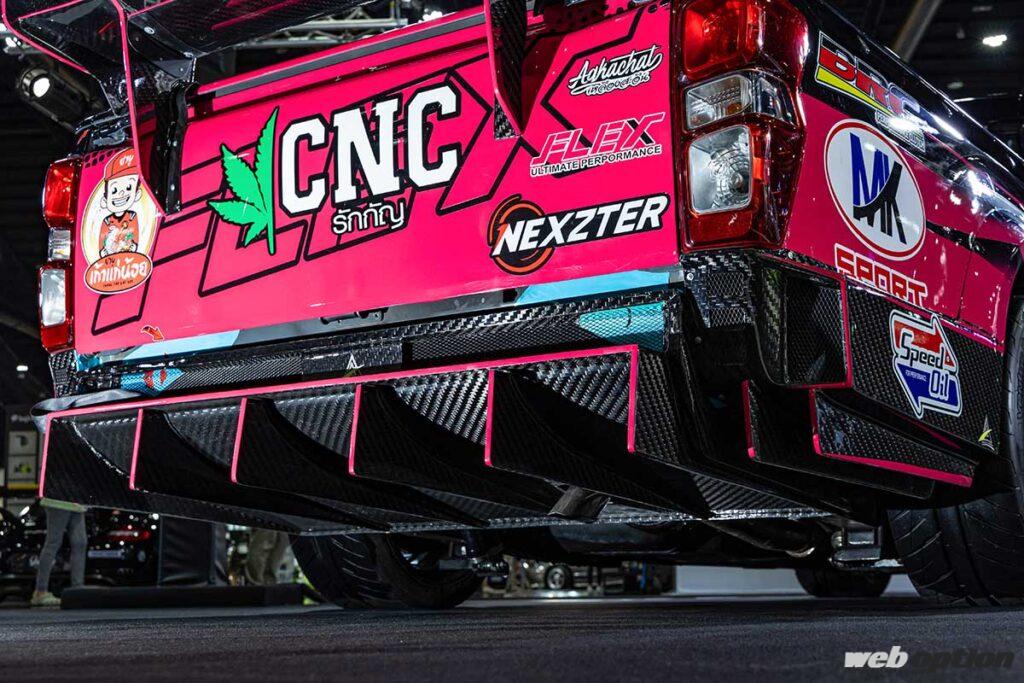 日本では商用車しか販売していない“いすゞ”だが、タイではピックアップのD-MAXやSUVのMU-Xなどを展開している。とくにD-MAXの人気は高く、サーキットやドラッグレースでも定番ベースになっているほどだ。こちらのマシンは、タイ・スーパーピックアップシリーズでチャンピオンを獲得したスーパーチューンドで、いすゞブースのセンターを飾っていた。