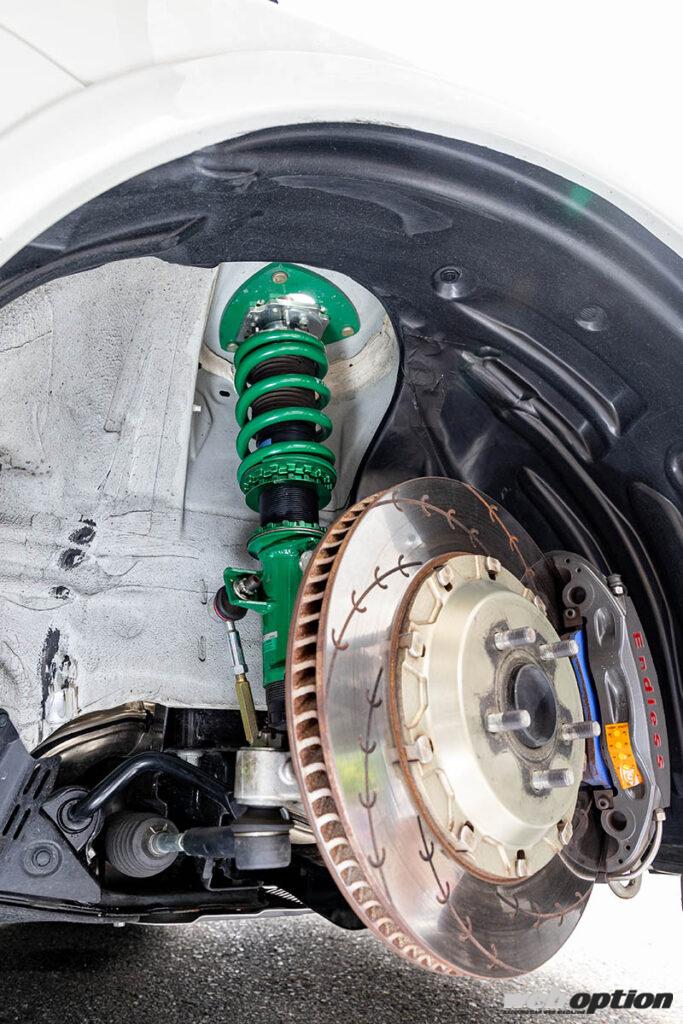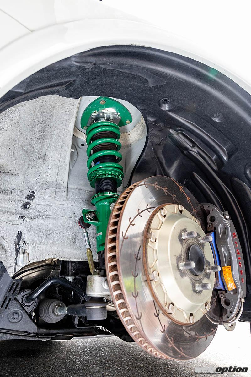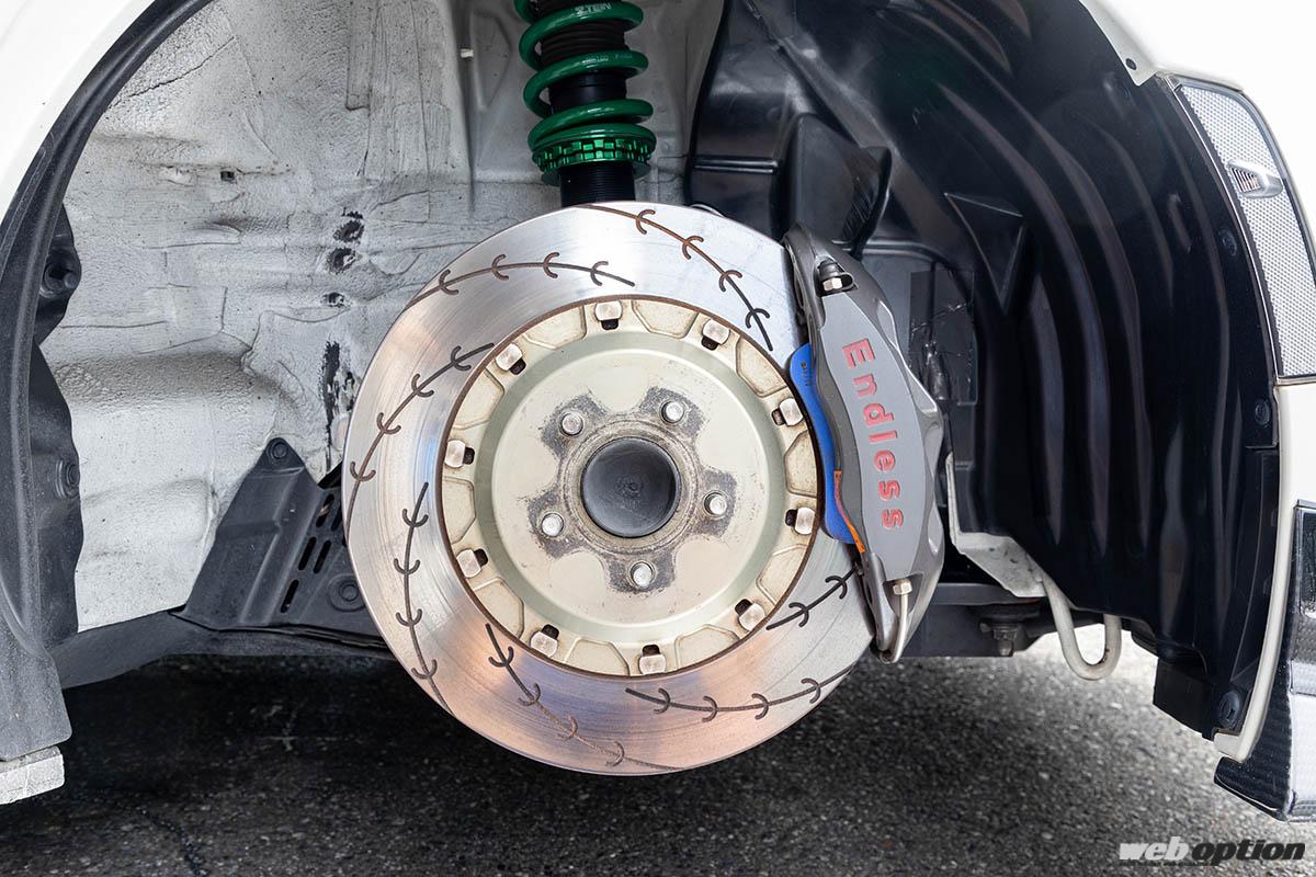 スポーツ走行では絶対的な制動力はもちろん、コントローラブルに車速制御が可能なブレーキチューンが重要。テスト車が装着するのは、エンドレスのMONO4レーシング(前後)で、ローターサイズは前345φ、後332φだ。