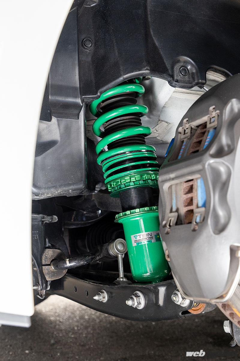 そのためのキーパーツとしてまず注目したいのが、テインMONOレーシングをベースとしたマルシェスペック車高調だ。その特徴は微低速域の減衰力セッティング用のM.S.V.バルブにワンメークレース用サスのパーツを投入している点。