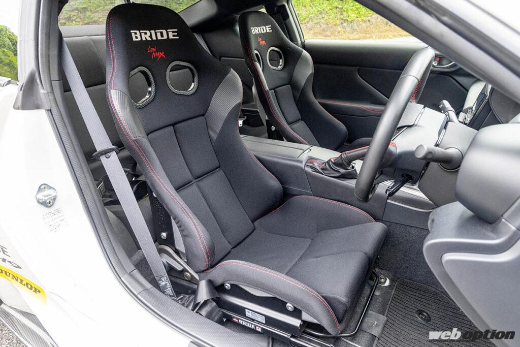 インパネまわりはほぼノーマルで、快適装備もフル完備。追加されているのはセンターコンソールのEDFCコントローラーくらい。シートはストリートの使い勝手を重視してブリッド・ストラディア3を選択している。