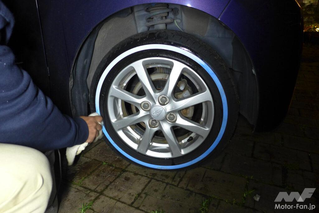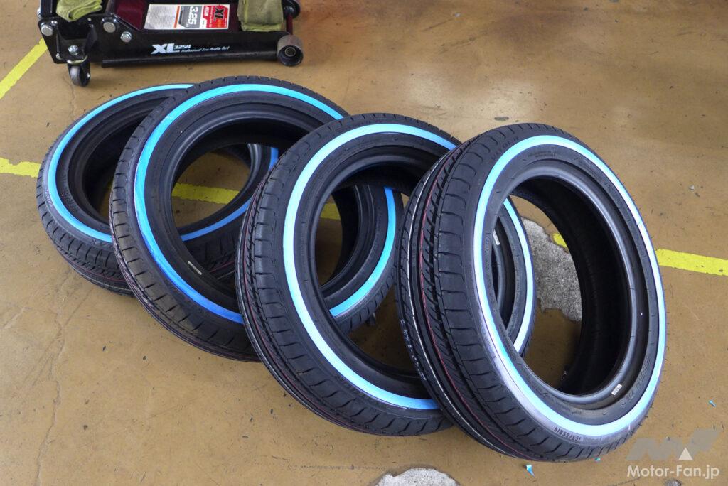 さっそく輸入・販売元のVITOUR TIRE JAPAN(アールプライド株式会社)に、ムーブに適合する155/65R14サイズのフォーミュラX WSWを4本注文。オーナーの自宅に届いたタイヤは、タイヤが汚れないように青いビニールで丁寧に梱包されていた。梱包の一部を解いて中を確認すると、サイドウォールにはブルーの保護剤が塗られたホワイトリボンが引かれていた。