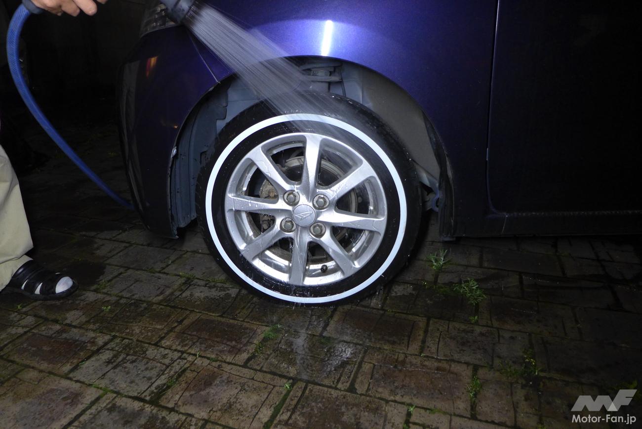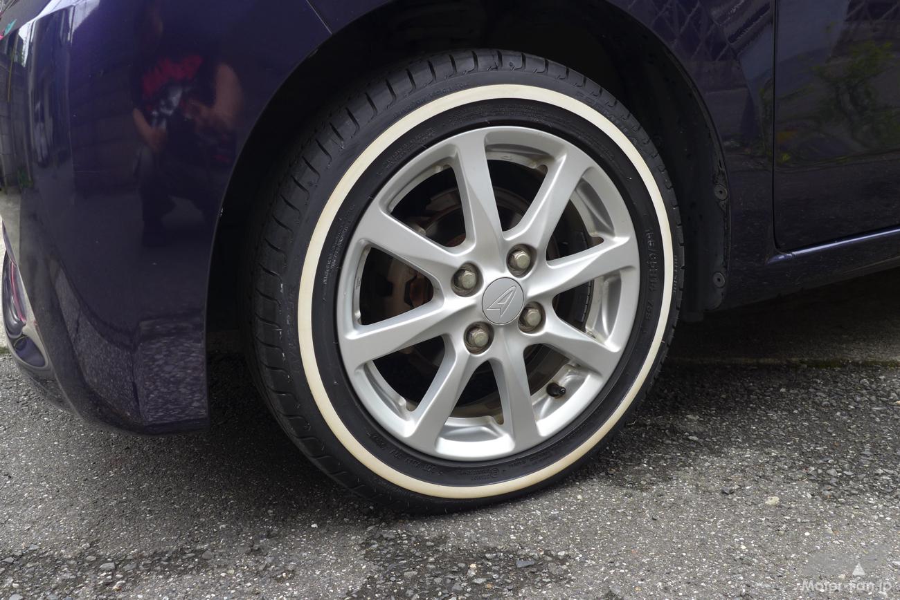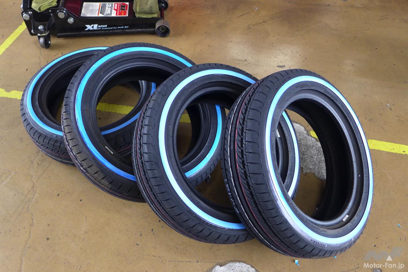 さっそく輸入・販売元のVITOUR TIRE JAPAN(アールプライド株式会社)に、ムーブに適合する155/65R14サイズのフォーミュラX WSWを4本注文。オーナーの自宅に届いたタイヤは、タイヤが汚れないように青いビニールで丁寧に梱包されていた。梱包の一部を解いて中を確認すると、サイドウォールにはブルーの保護剤が塗られたホワイトリボンが引かれていた。