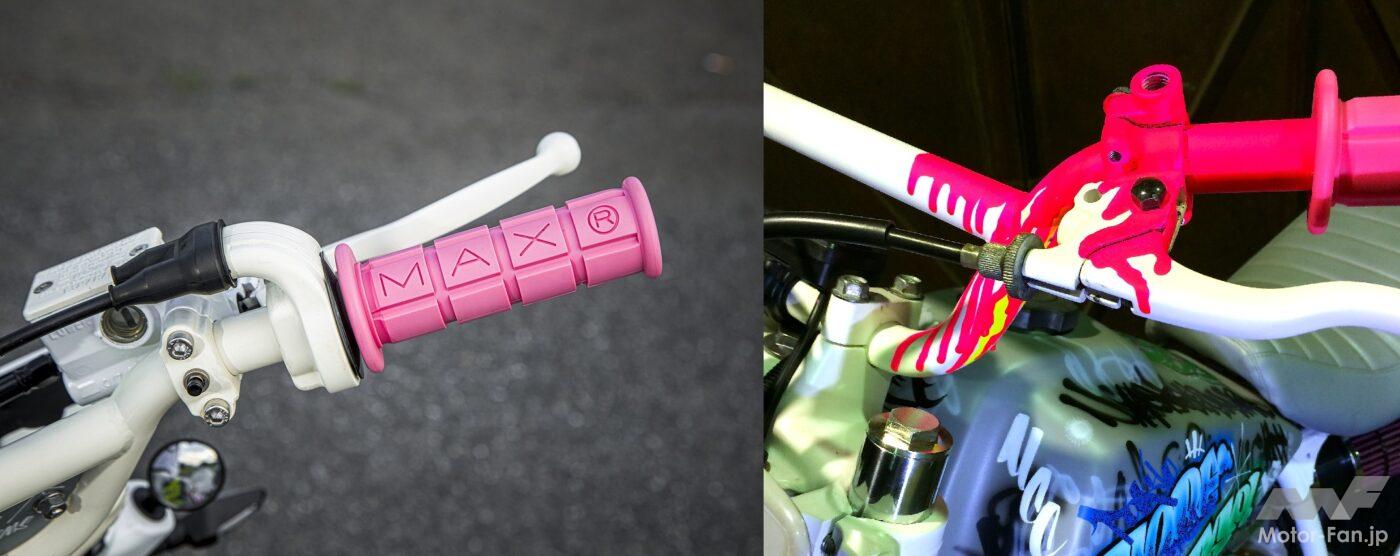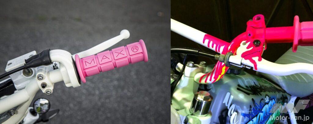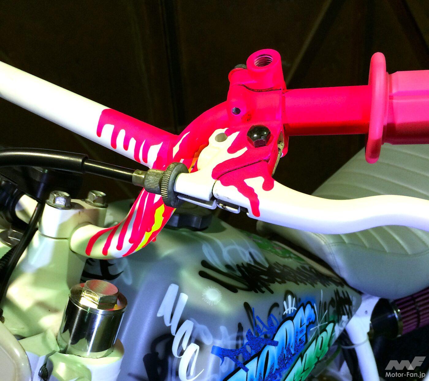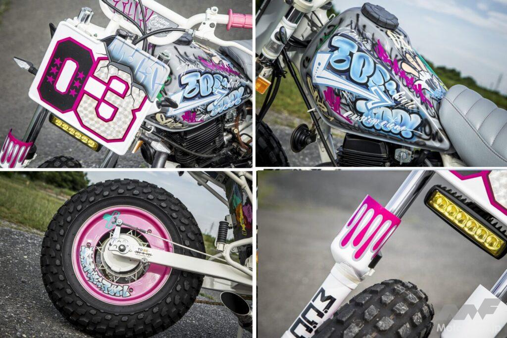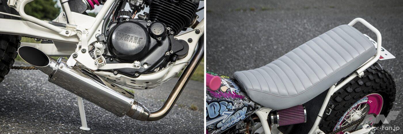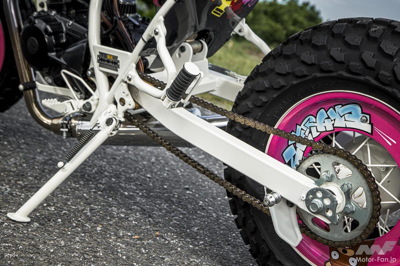 タックロールシートやスラッシュカットマフラーといったオリジナルパーツによってカスタム感を与えており、細かな箇所ではシート下にボックスを配置して小型バッテリー(5LBS)やレギュレーターといった電装部品を収めることで“スカッ”とした空間を実現。