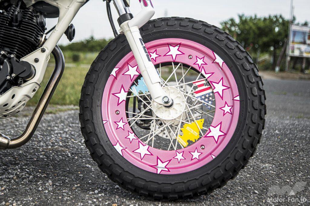 このTW225(デモ車)でまず目に入るのが「ホイールカバー(キャップ)」だ。スポーツタイプの自転車のほか、バイクならクルーザー系やカブ系などのカスタム車でも見かけることもあるが、本来はスポークリムの足元に“キャンバス”を追加し、塗装やピンストが追加されるとインパクトは絶大!