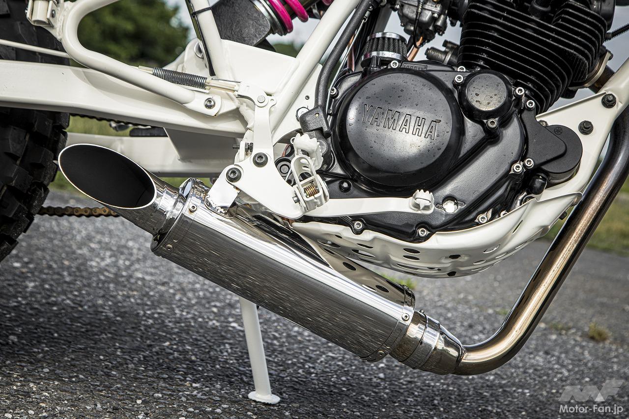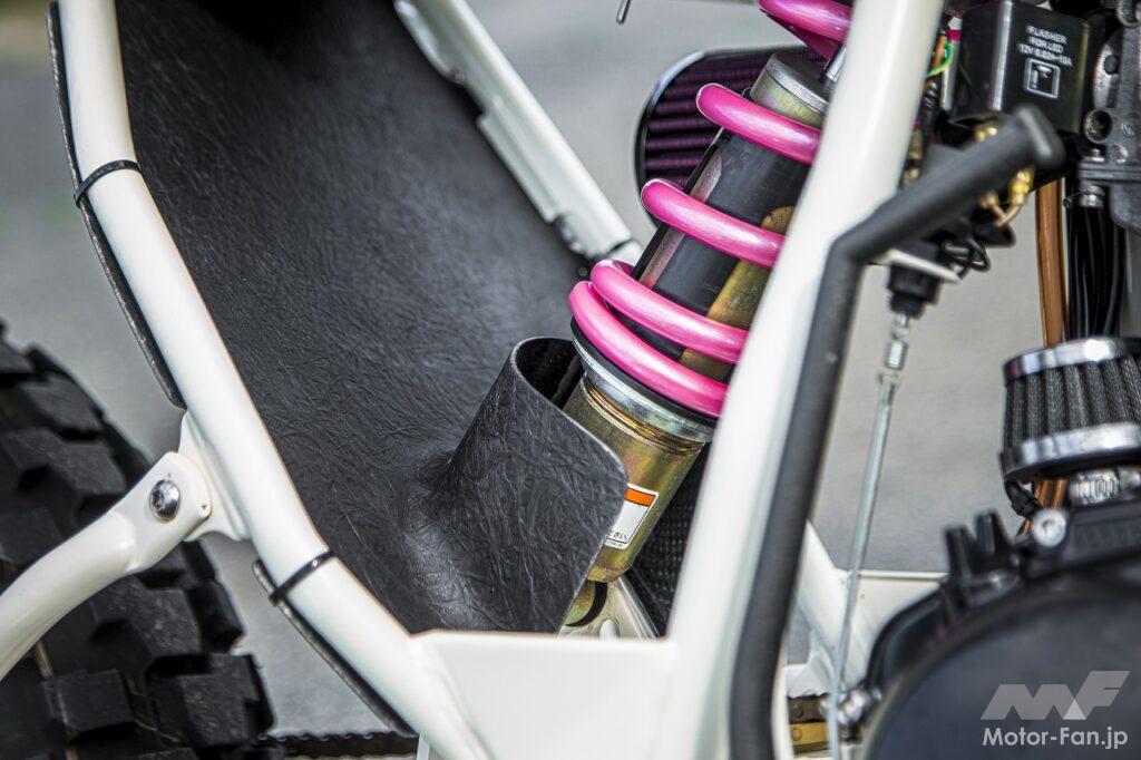 フロント周りではBMXライクなショートハンドルに「ゼッケンプレート」を追加して“ダートラ”の雰囲気を演出。コックピット周りをすっきりさせるために定番のバーエンドミラーではなく、オリジナルステーを用いてフロントフォークにミラーをセットしているのも見どころだ。さらに無骨な「フロントフォークカバー」も良いアクセントになっている。