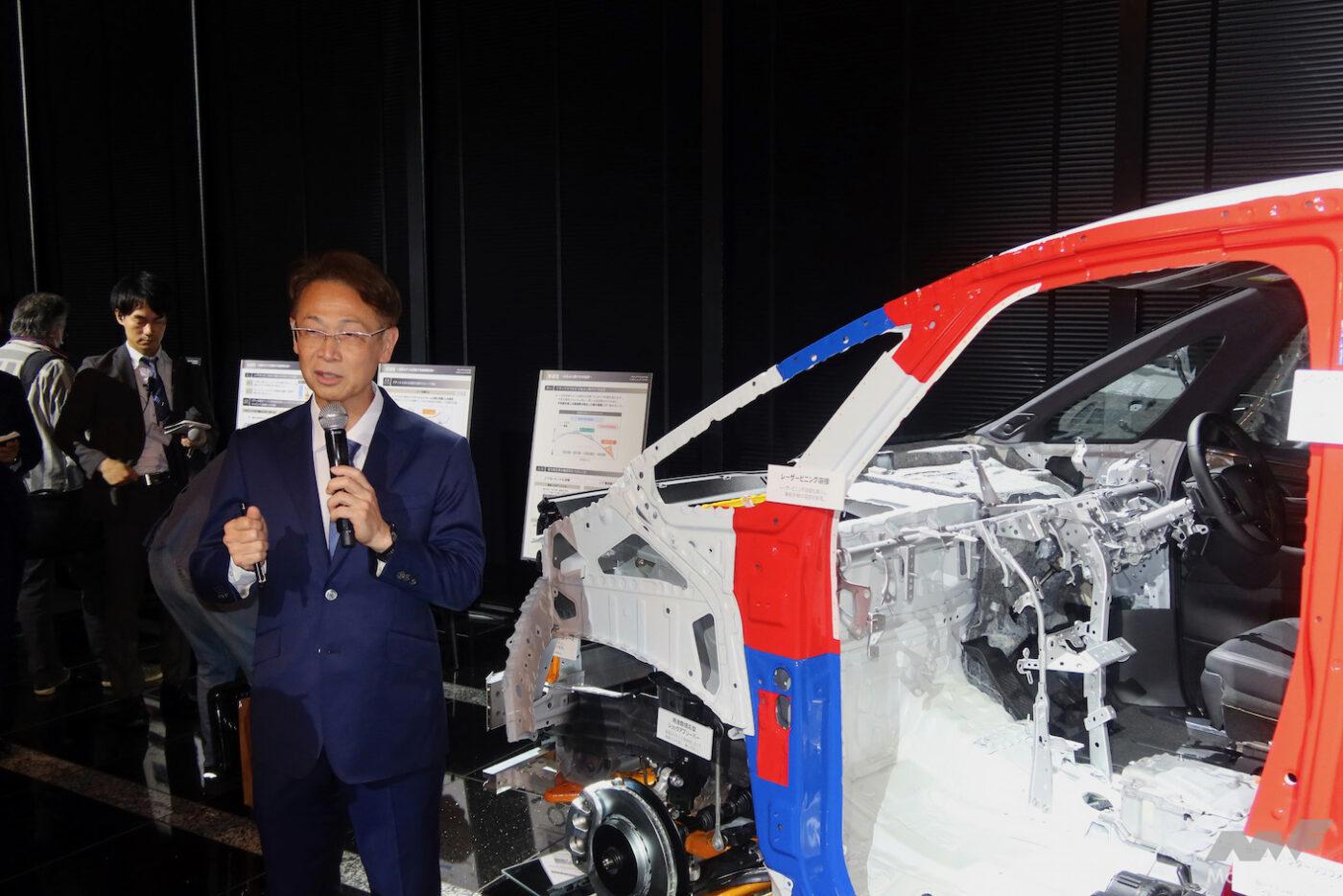 「ボディ剛性は従来比で50%向上させました」と、開発責任者の吉岡憲一氏は説明した。新型アルファード/ヴェルファイアの発表会場でのことである。「とくに着力点、フロントのサスタワーやリヤのホイールハウスについては30%向上させています」と付け加えた。
