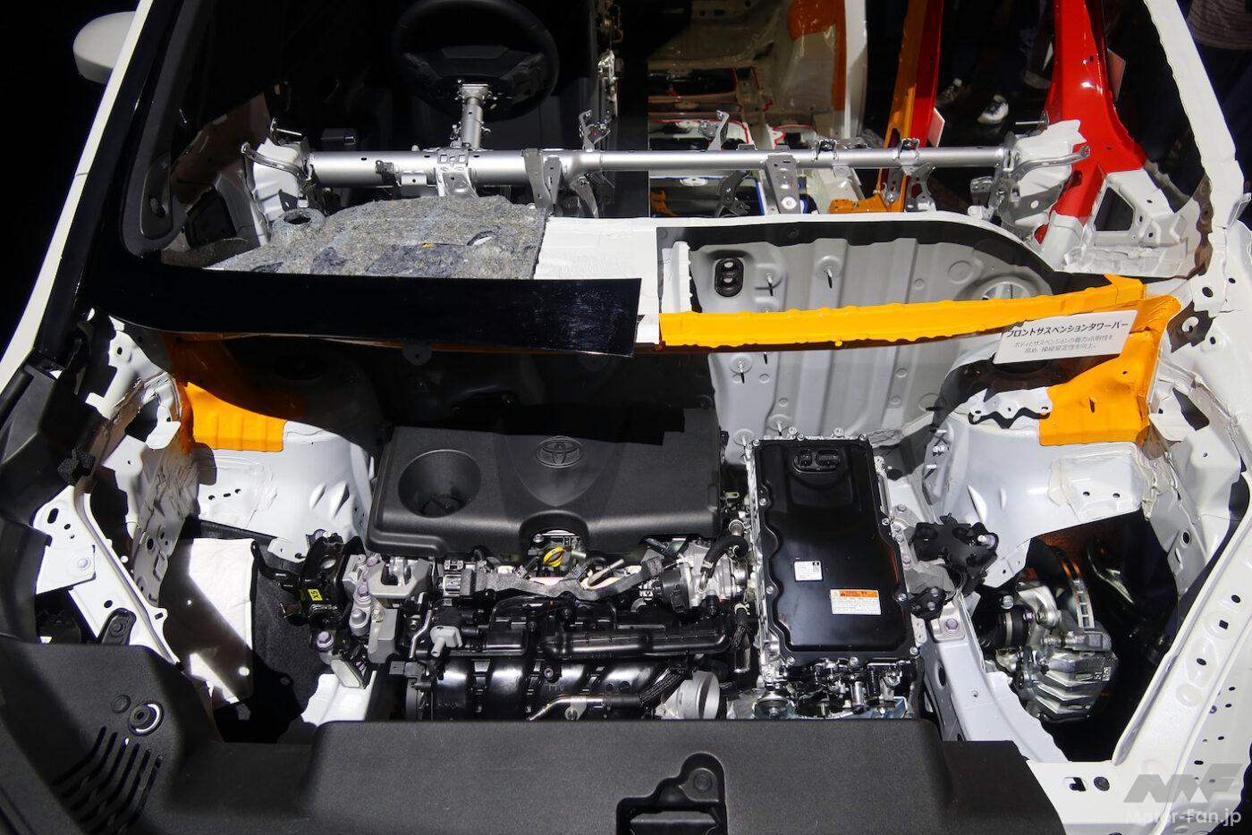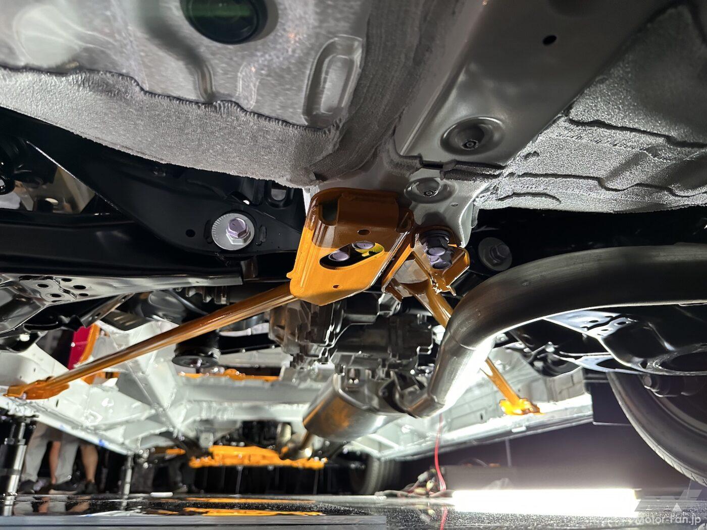 カットボディのエンジンコンパートメントを覗き込むと、バルクヘッド寄りにオレンジ色に着色されたフロントサスペンションタワーバーが確認できる。いわゆるストラットタワーバーと似た働きをするパーツで、サスペンションの入力を受け止めるダンパートップの剛性を高める(変形しにくくする)働きをする。