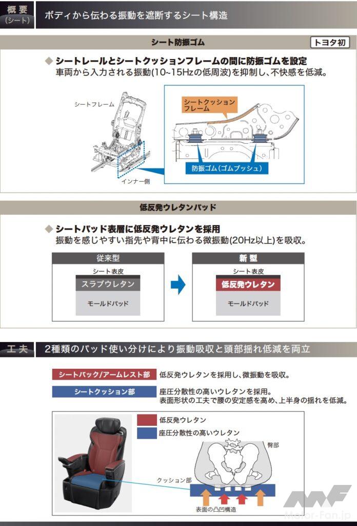 人が不快に感じやすい10〜15Hzの振動を抑制するため、シートレールとシートフレームの間に防振ゴム(ゴムブッシュ)を配置したのが特徴。さらに、シートパッド表層に低反発ウレタンを採用することで、振動を感じやすい背中に伝わる20Hz以上の振動を吸収する設計とした。また、シートクッション部は表面形状の工夫で骨盤を少し前傾させて座らせるようにした。骨盤が寝た姿勢で座ると首の揺れが大きくなるからで、骨盤を立てた状態で座らせることで、首の揺れを抑え、快適性の向上につなげる考えだ。