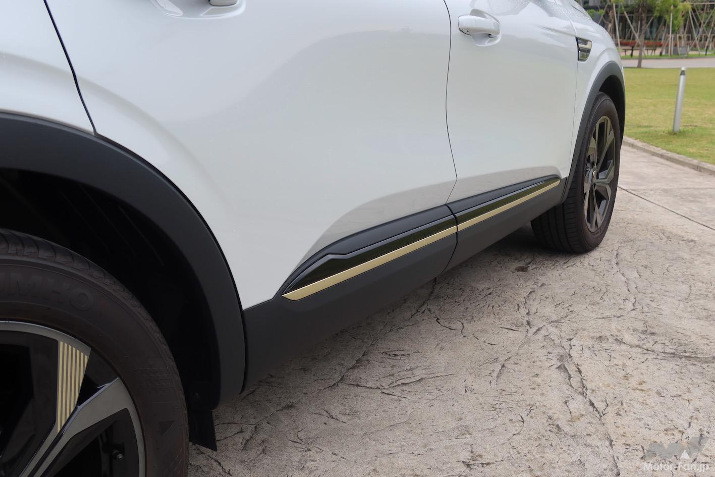 今回設定された「エンジニアード」は、ルノーのコーポレートカラーであるイエローをモチーフにしたウォームチタニウムカラーの差し色をエクステリアとインテリアの要所に施したのが特徴。アルカナ、ルーテシアとも、F1のフロントウイングに範をとったフロントバンパー、サイドプロテクションモール、エキゾーストフィニッシャーがウォームチタニウムカラーとなっている。ブラックアウトされたフロントグリルや前後エンブレムとの相性が良く、精悍なイメージだ。