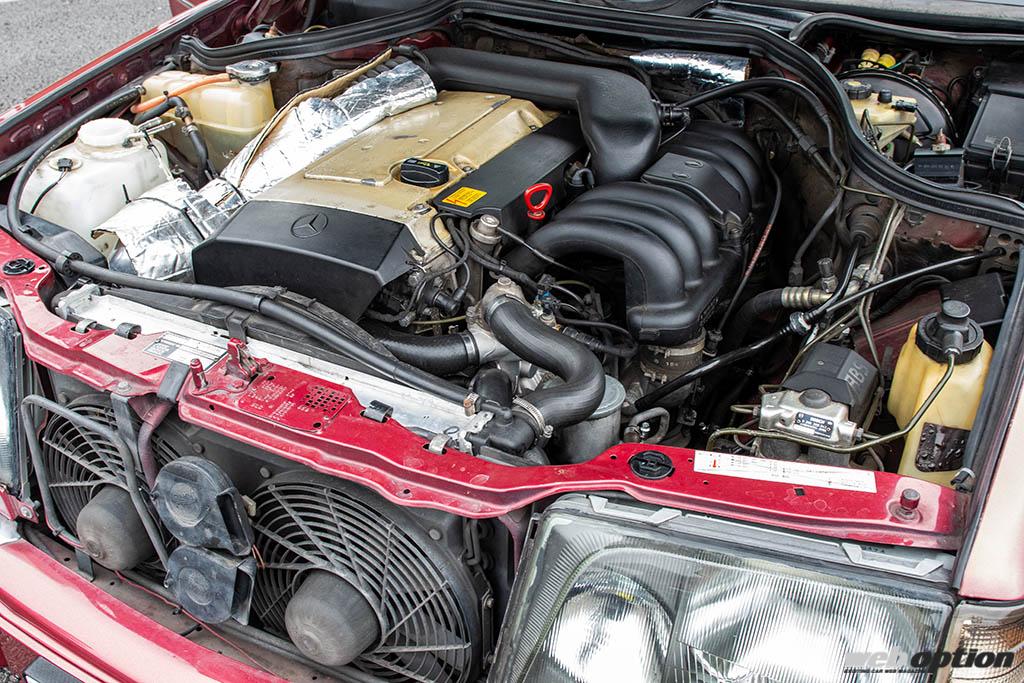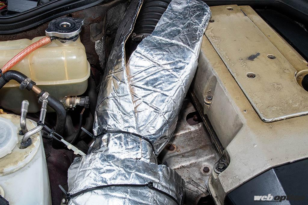 エンジン本体はノーマルとのことだが、W124の泣き所のひとつと言われるエアフロセンサーは熱害から保護するために断熱マットを巻いている。