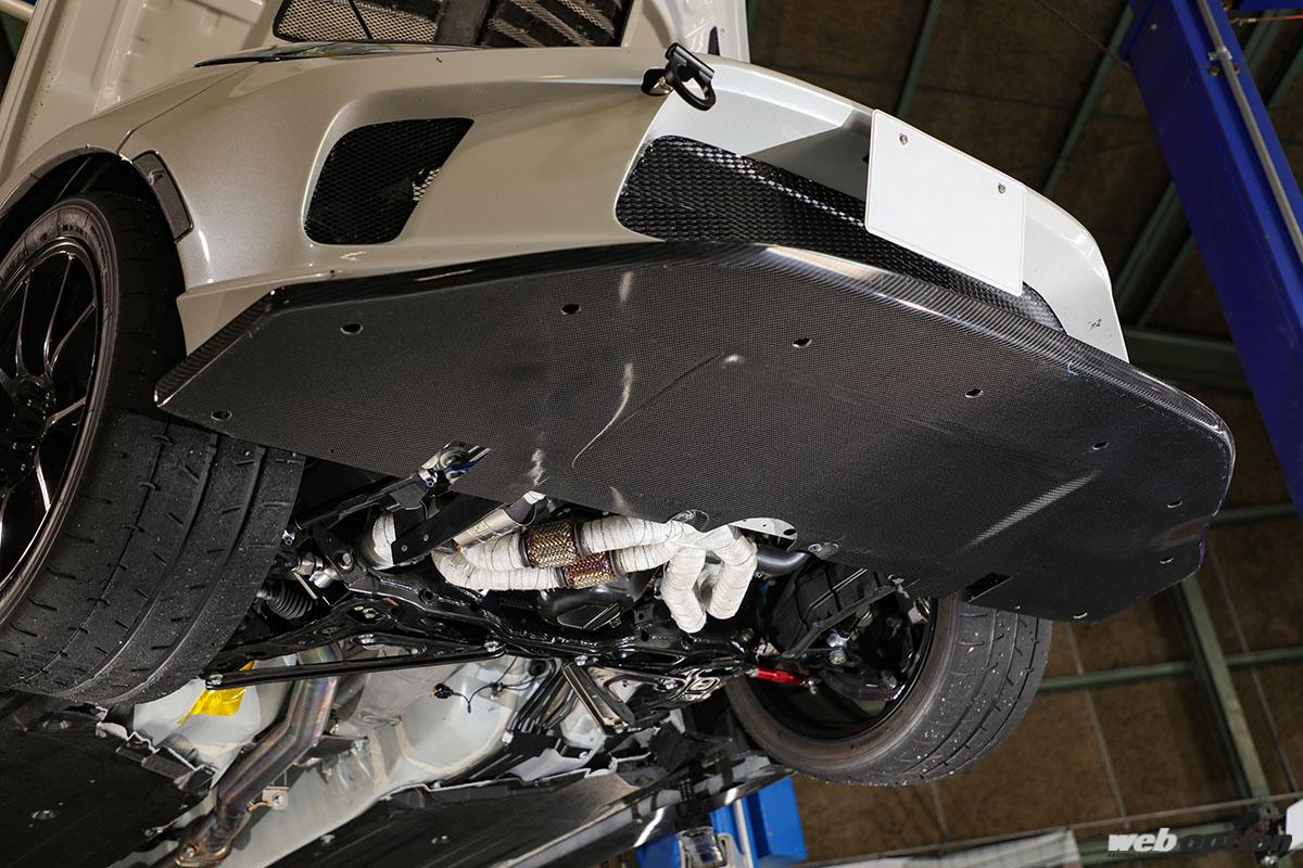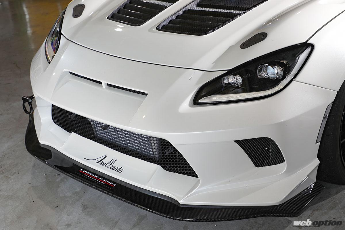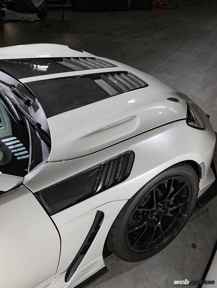片側10mmのフロントワイドフェンダー(FRP:6万8200円/カーボン:8万2500円)は、タイヤハウス内の乱流を効果的に引き抜く構造が取り入れられる。ボンネットはエンジンルーム内のヒートエアを効率的に逃がすためのダクトをデザインに取り入れつつ軽量化も実施。