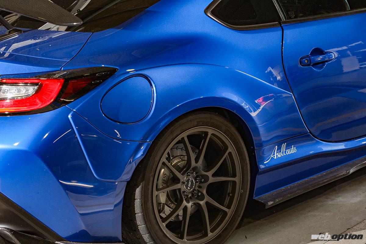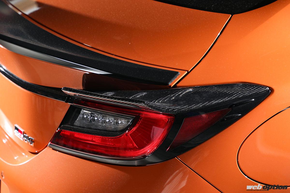 サイドステップ(FRP:7万9200円/カーボン:10万7800円)に関しては、ステップの高さを極端に変えることなくリヤ側に視線を誘導するプレスラインでイメージを一新。過剰なデザイン性を求めるのではなく、GR86/BRZのフォルムに合わせ性能を引き出すための最善の形状となる。