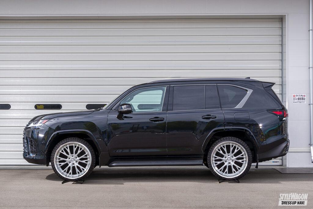 LX向けは上品さも漂うシティオフローダースタイルを提案。プレミックスMER-Xはスタイリッシュなフィンスポークモデルで、足長感のあるリムオーバーデザインを採用。デモカーが装着しているのは20インチながら、視覚的にはそれ以上に大きく見える。純正の平座ナットをそのまま使えるほか、レクサス純正センターキャップを装着可能なのもメリットだ。リアル大口径を求める人にはLSバサラSUVを。22インチと24インチがあるが、思い切って後者を選ぶのもアリ。6穴向けに最適化されたメッシュデザインなのでバランス良し。3ピースホイール特有の高級感に加え、リムやインセットを幅広い設定の中から自由に選べるのも魅力。