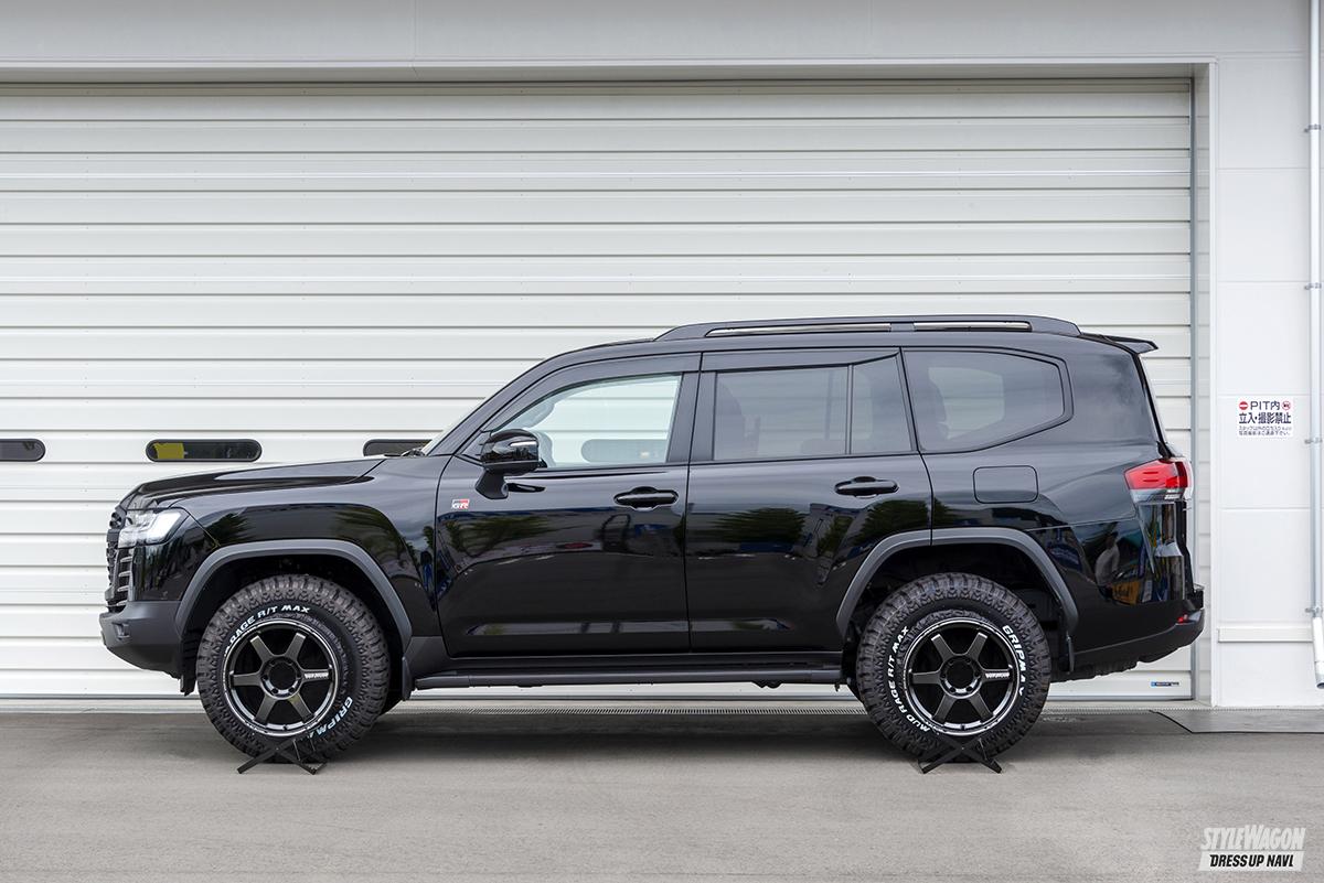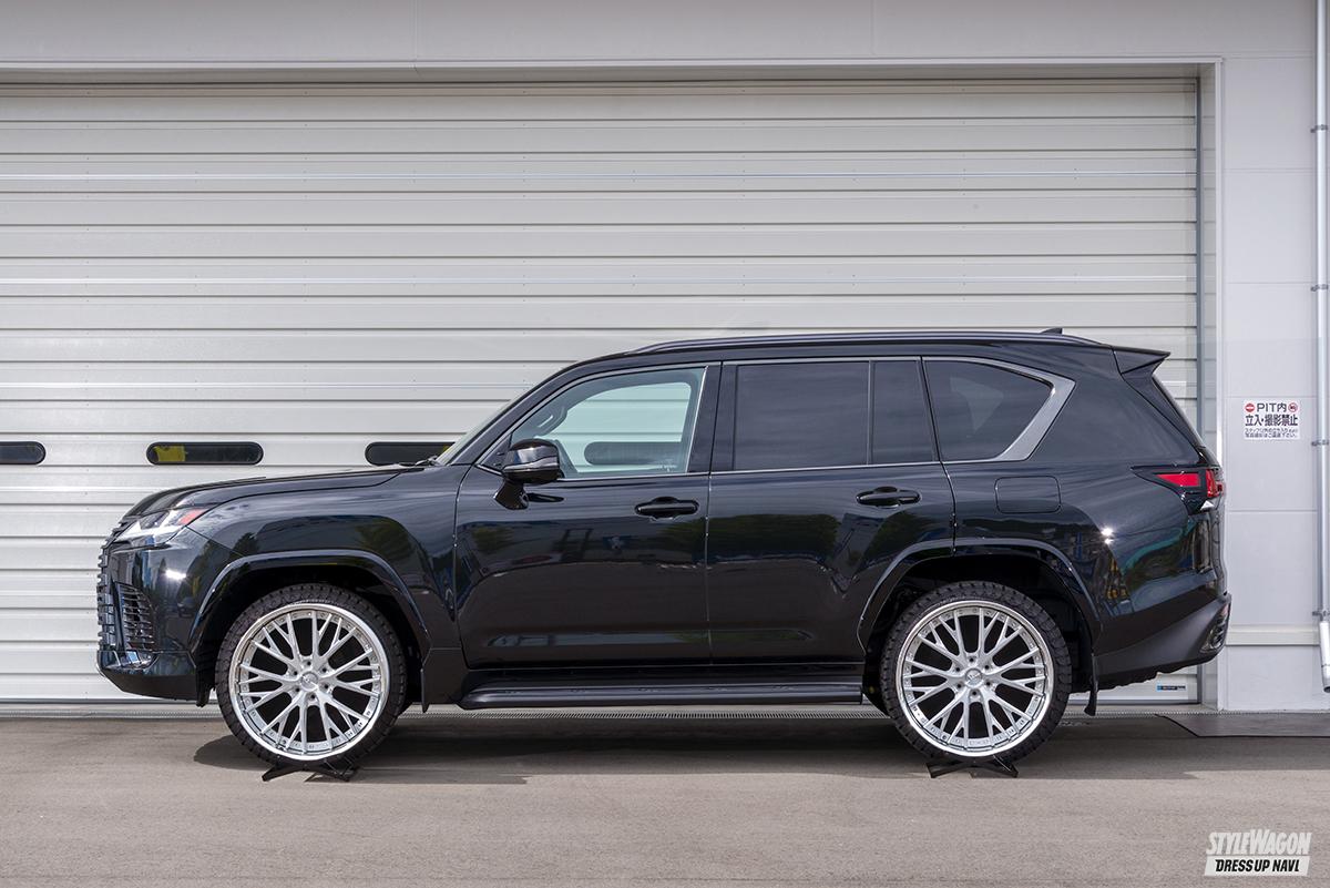 LX向けは上品さも漂うシティオフローダースタイルを提案。プレミックスMER-Xはスタイリッシュなフィンスポークモデルで、足長感のあるリムオーバーデザインを採用。デモカーが装着しているのは20インチながら、視覚的にはそれ以上に大きく見える。純正の平座ナットをそのまま使えるほか、レクサス純正センターキャップを装着可能なのもメリットだ。リアル大口径を求める人にはLSバサラSUVを。22インチと24インチがあるが、思い切って後者を選ぶのもアリ。6穴向けに最適化されたメッシュデザインなのでバランス良し。3ピースホイール特有の高級感に加え、リムやインセットを幅広い設定の中から自由に選べるのも魅力。