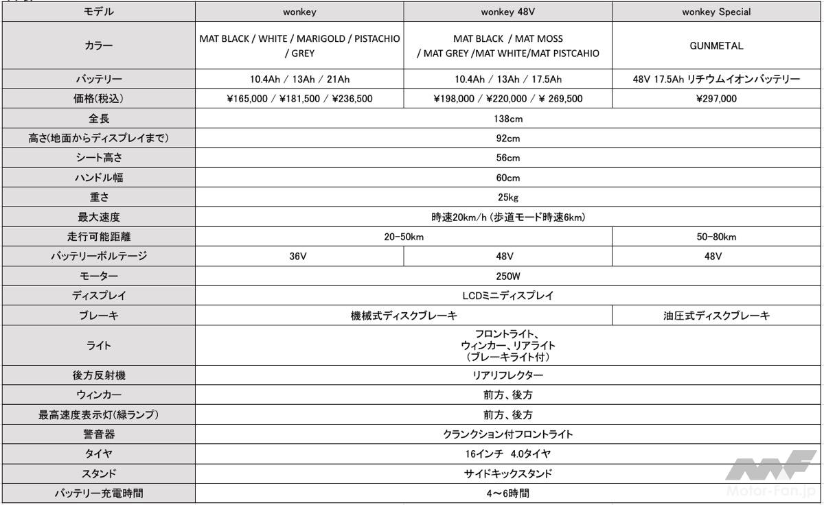今回の発表では、バッテリー容量の選択肢が増えた点も大きなトピックだ。従来は10.4Ahのバッテリーが標準装備だったが、新たにwonkey(36V)には13Ahと21Ah、wonkey 48Vには13Ahと17.5Ahのオプションが追加された。これにより走行可能距離は最大約80kmにまで伸び、通勤や街乗りでの実用性が格段に向上する。