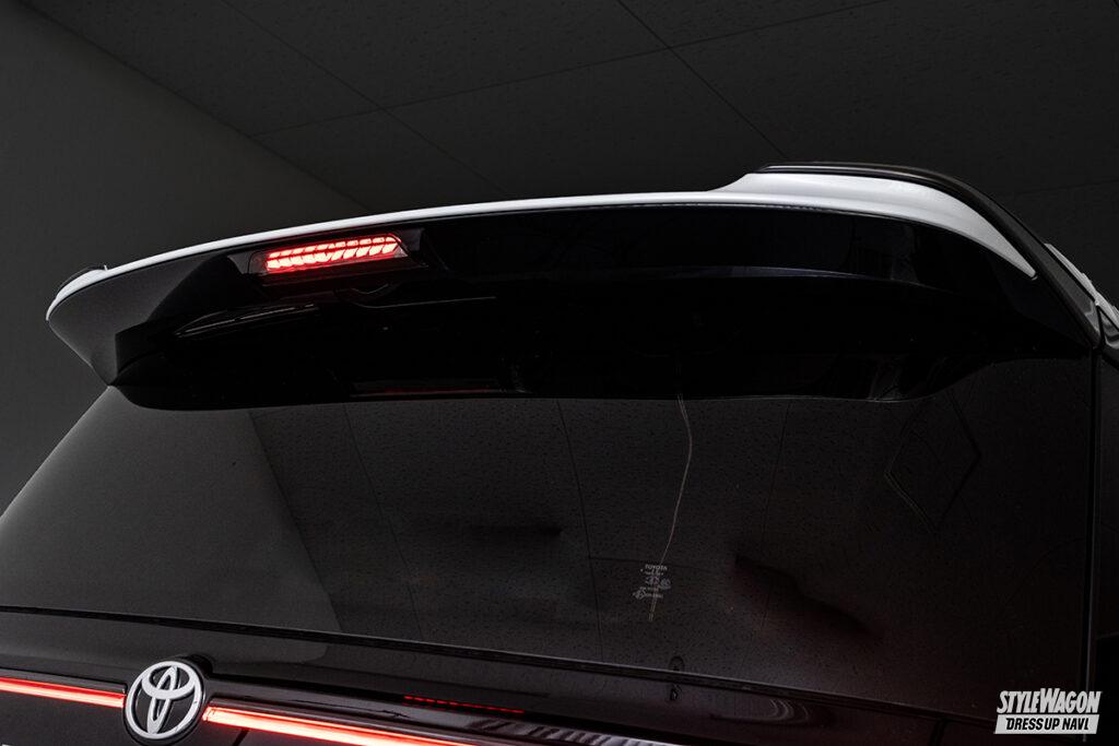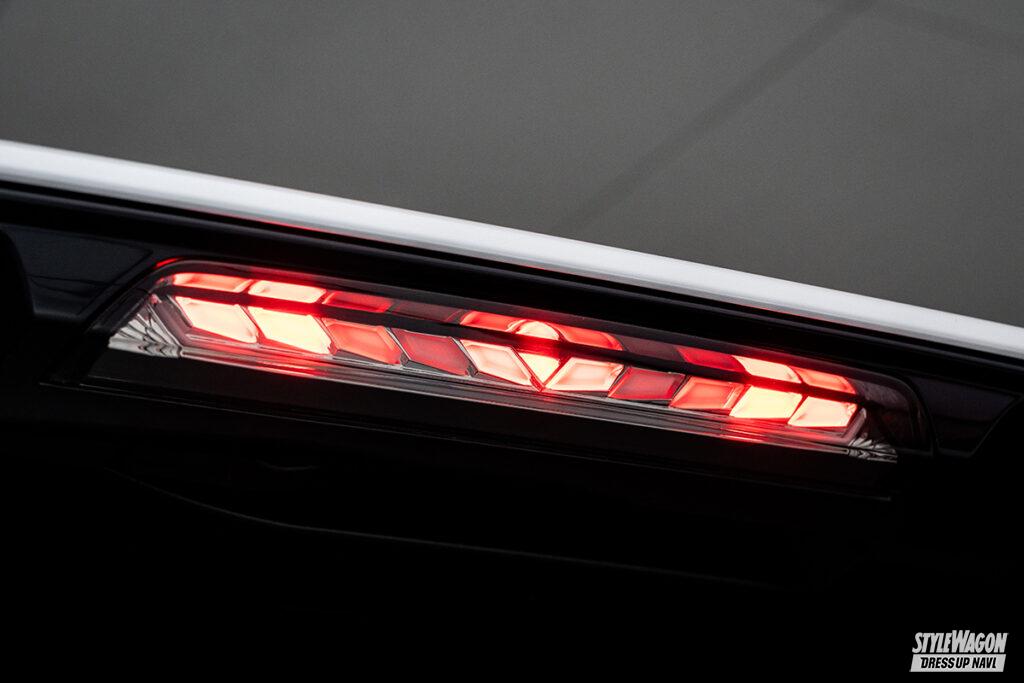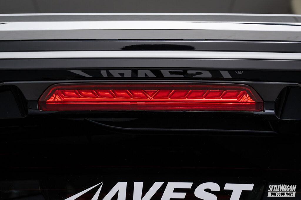 今年11月頃のリリースを予定している40系用のリップライン付きハイマウントストップランプは、先代30系でも人気を博したモデル。ポジション点灯時は、矢のようなデザインのセグメントブロック部の発光と、レンズ下段に設けられたリップラインでの発光という、2パターンの切り替えが可能。また、ウインカー時はレンズ中央部から外側に向けてアンバー光が流れるように点灯するだけでなく、ポジションONでアピール度抜群のアクションが始動と、多彩なライティング機能が楽しめる仕様となっている。レンズ内はメッキで区切られた立体構造のため、消灯時でも存在感はバッチリ。シーンを問わず、スタイリッシュなリアビューが手に入る逸品なのだ。。