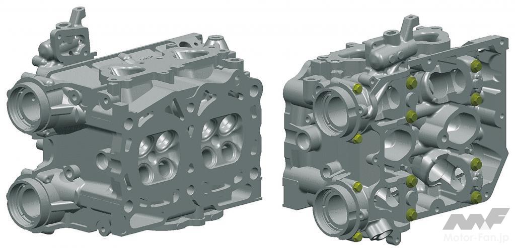 それにしてもEL15は、EJ15との比較において、一気に13.2mmものストロークアップである。ちなみにEJ20と比べてもEL15のストロークは4mmも長い。水平対向エンジンの場合、この延長分は左右方向それぞれに伸びる関係で、エンジン幅寸法の拡大が余儀なくされる。しかし、ある程度の舵角も必要となるホイールハウス分を差し引くと、エンジンコンパートメント内のスペースには限りがある。安易に車幅を広げたくない以上、エンジンにおけるコンパクト設計の追求が重要なテーマとなった。ピストンが上下するとき、シリンダーへの側圧は上げたくないためコンロッドの短縮は避けたい。そこで小端からピストンクラウンまでの距離や大端部分の触れ幅をとことん詰めるなどコンパクト設計が徹底された。