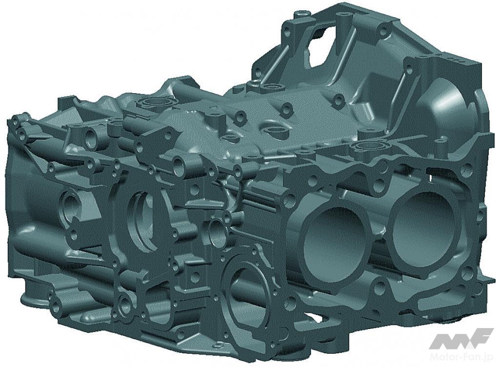 直4と比較して短いクランクケースを左右から挟み込んでひとつの剛性体を成すシリンダーブロック。高剛性の確保に有利となり、結果的に軽量設計が可能となる。シリンダーは2気筒ずつ左右に分かれるため単体部品重量が軽い点も特徴である。