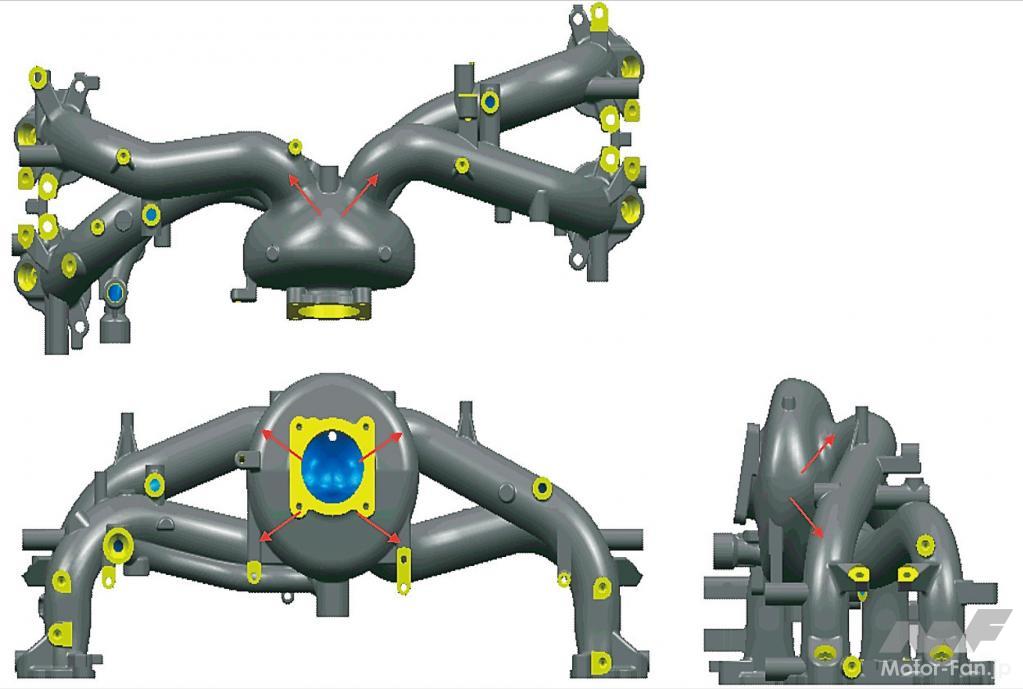 インテークマニフォールドは、各気筒への吸気分岐を等長に配置してあるのが特徴だ。吸気慣性効果を最大限に発揮させている。吸気通路の断面積や長さを最適化し、スロットル通過後はスワールを与えて流入促進を図り、低中回転域のトルク向上と高回転時の出力アップを達成している。