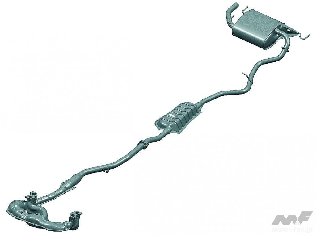 エキゾーストシステムには、等長エキパイを持つ4into1集合排気管が専用開発された。排気干渉を低減し、排気脈動を最大限に活用するデザインだ。キャタライザーはフロントの直後にセカンダリーを装備したタンデムレイアウト方式。後部には17ℓ容量のマフラーが横置きに設置されている。