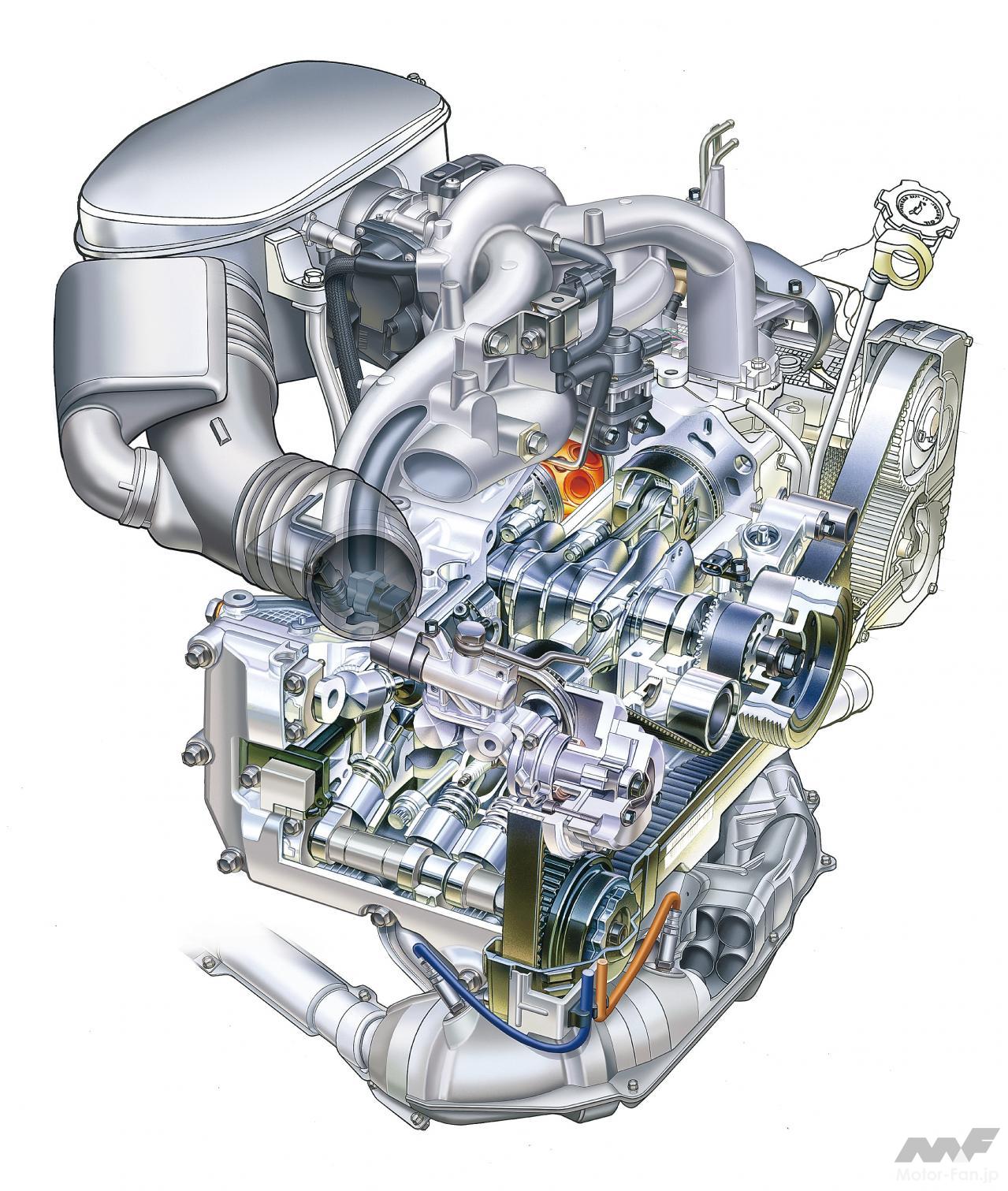 新設計されたシリンダーヘッド。圧縮比は若干高く10.1になっているが、指定ガソリンはレギュラーである。コンパクト化されたペントルーフ型燃焼室と、吸気ポートの形状変更に合わせ、ピストンクラウン面の形状も最適化されている。タンブルガス流動を促進し、新気の充填効率が高められ燃費改善やエミッション性能の向上に貢献している。