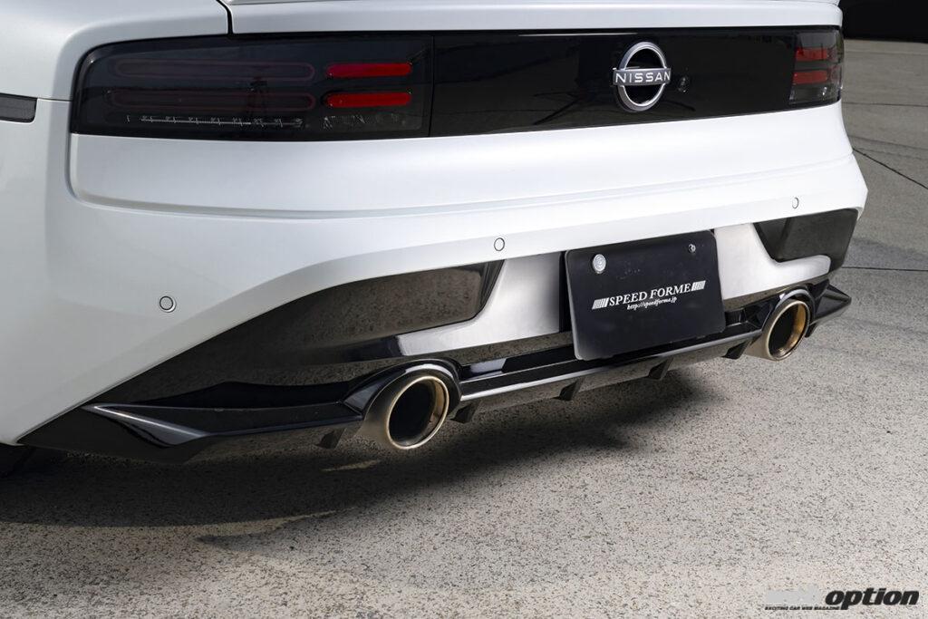 両サイドの押し出し感を強めてS30らしさを引き出したフロントリップスポイラー(FRP:11万円/カーボン:19万8000円)は、段差などで傷付いてしまった際にも補修しやすい3ピース構造を採用。バンパートップとシンクロしたラインで前方へ押し出したセンターダクトが疾走感を放つ。