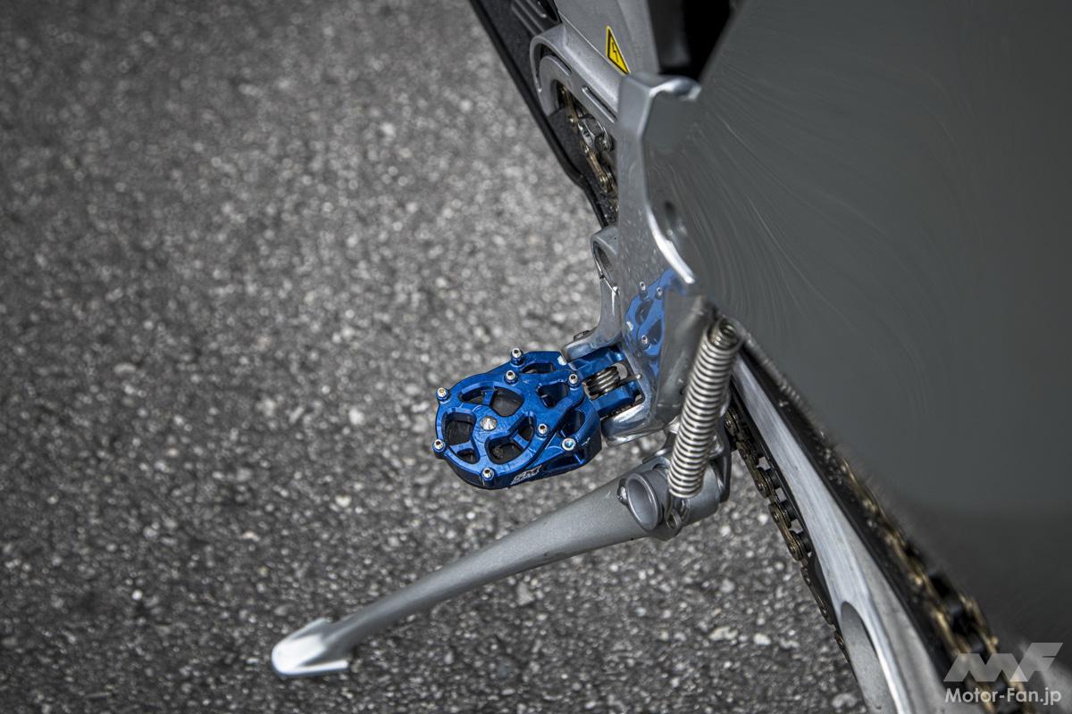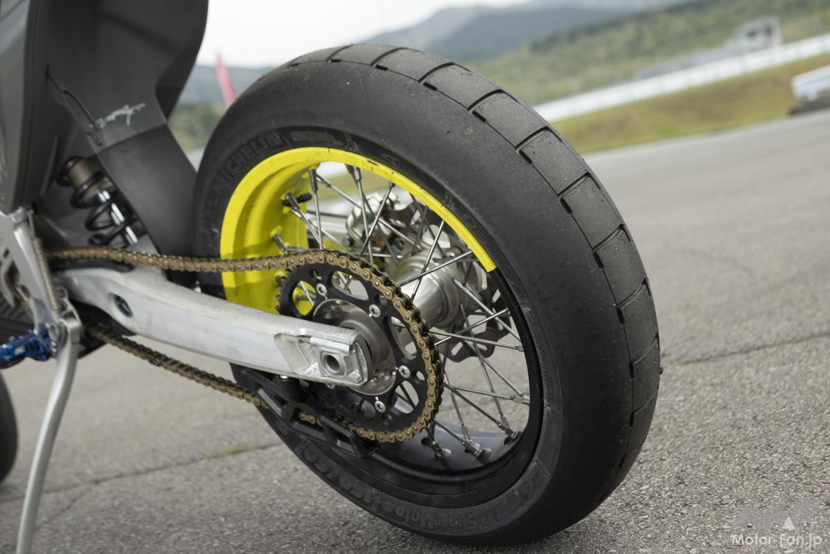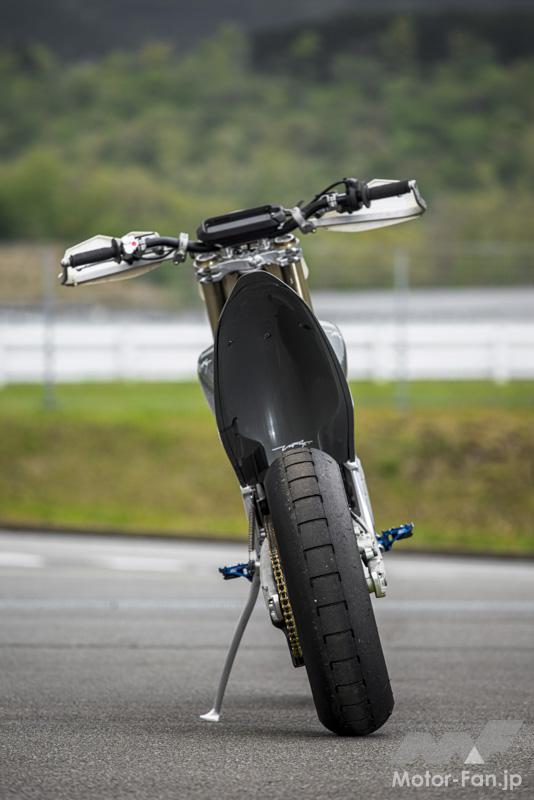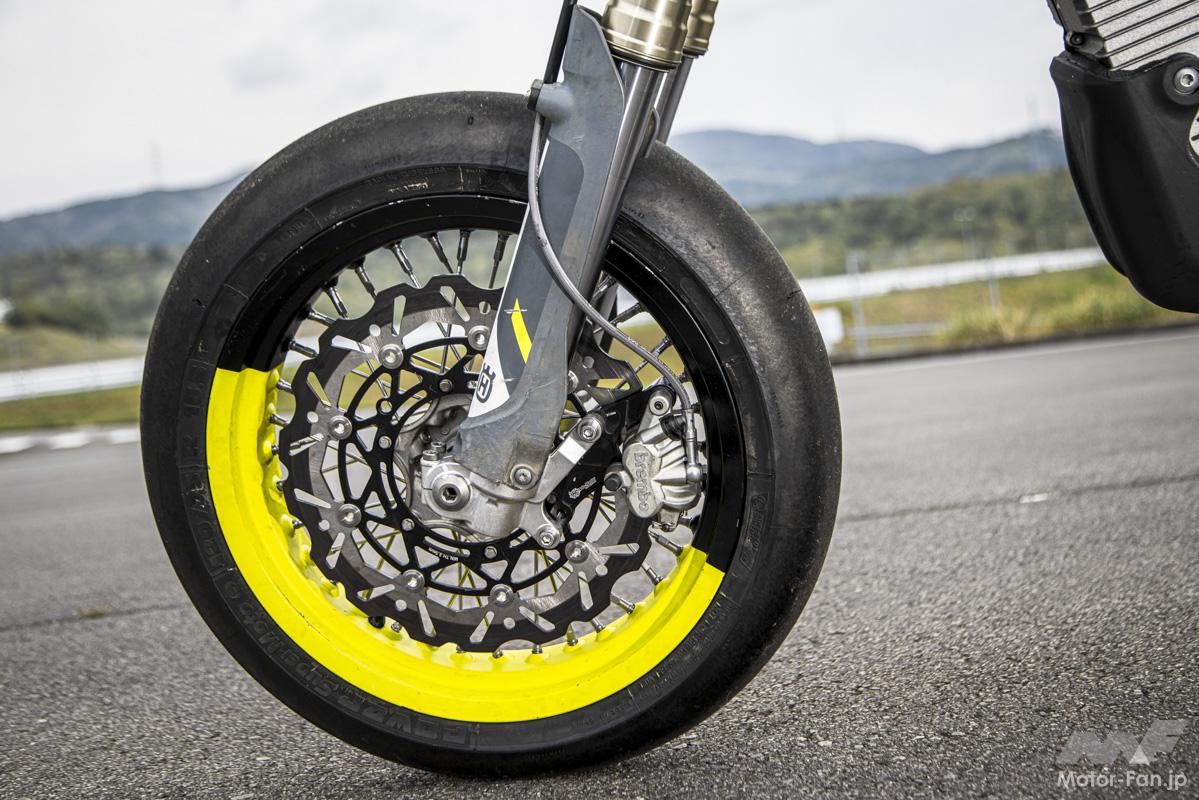 オンロードサーキットを走行するのでタイヤはモタードスリック。オーナーはオフロードとロードコースでホイールを付け替えて楽しんでいるのだと言う。