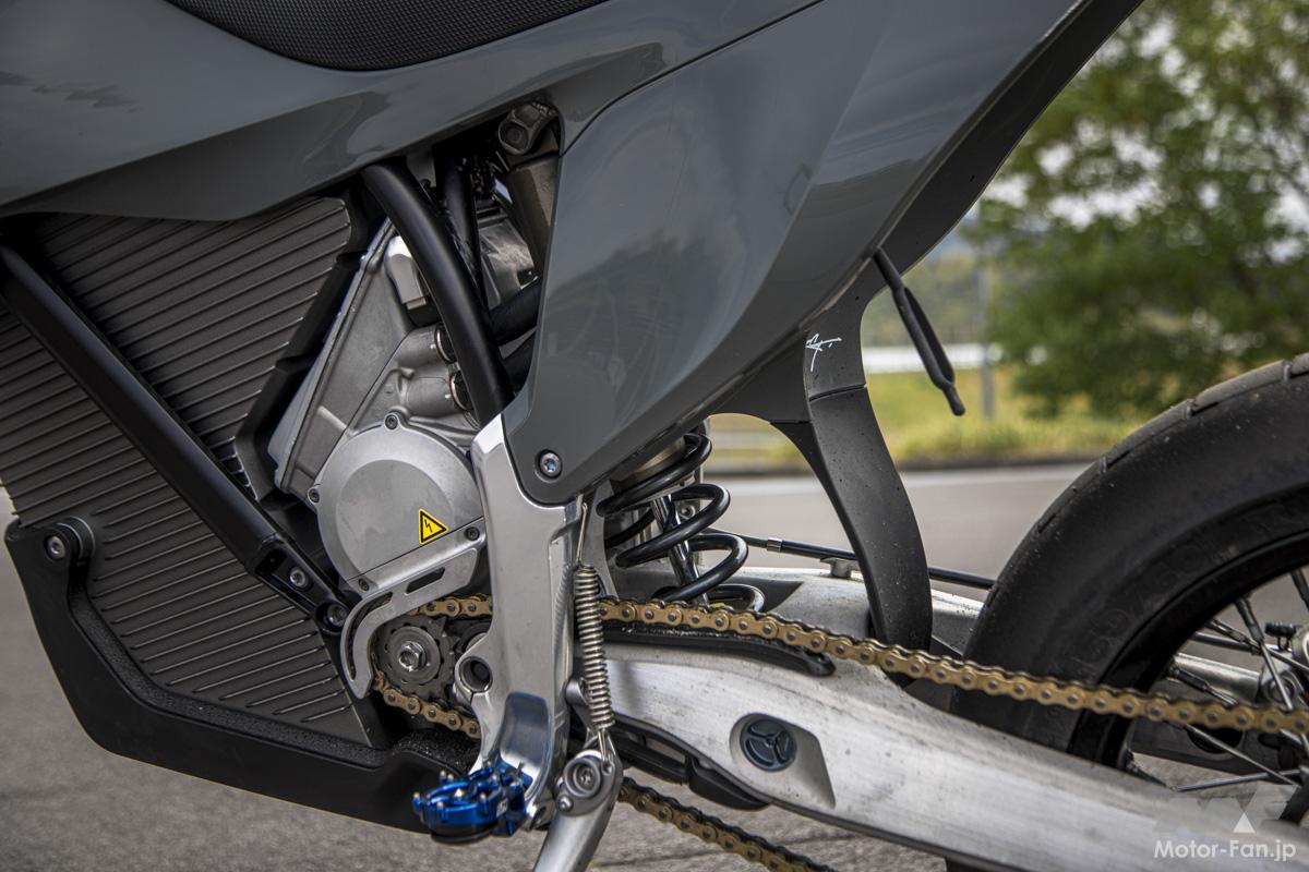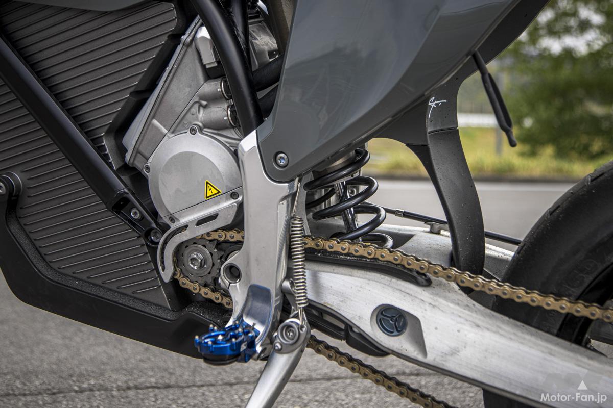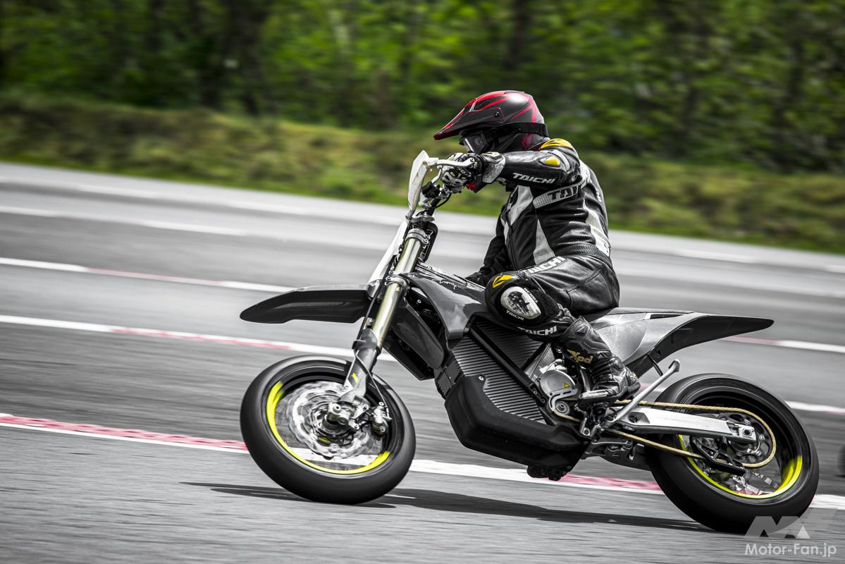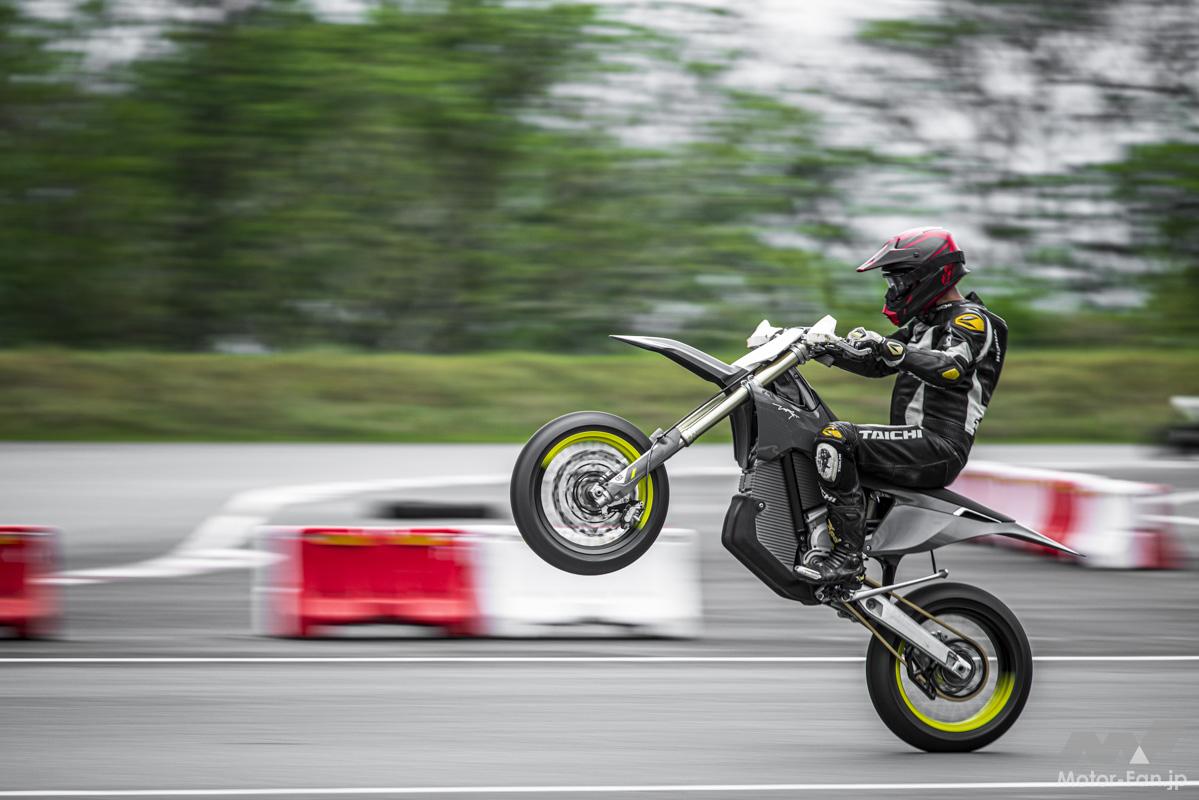 そして次はいよいよマックスの80馬力。今度はスロットルをオフにした状態でボタンを押しスロットルを開けると後輪で938Nmという驚愕のトルクが炸裂。これまで体感したことがないようなパワーフィーリングでマシンが加速した。最終コーナーから1コーナーまでの直線ではフロントタイヤが浮きっぱなし。カートコースくらいのスピードレンジでは、どんな場所でもスロットルを大きく開けたらすぐにフロントが離陸してしまう。「それじゃあパワーは使い切れないだろう」と思われるかもしれないが、それがエンジン車と違うところ。