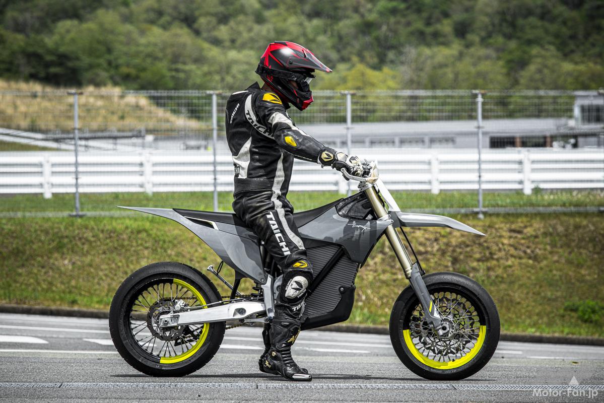 電源スイッチを入れてスロットルを開けると微かなモーター音とともにマシンが動き出した。最初は慣熟のために20馬力の設定でコースを走り出したのだが、この時点で十分に速い。250クラスのロードスポーツをストレートでバスできるくらいのパワーがある。
