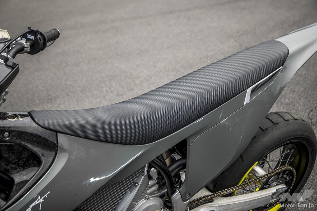 競技用のオフロードモデルなのでサスペンションは長いが、前後ホイールが17インチ化されているのでモタード仕様であれば足つき性はそれほど悪くない。両足をつくとカカトが若干浮く程度。