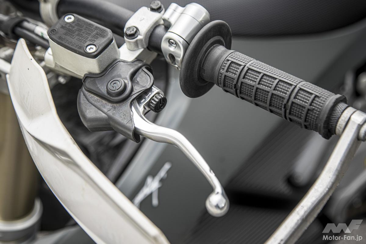 クラッチ操作の必要がないのでリアブレーキは左のレバーで操作する。オプションで右のフットペダルにすることも可能だ。