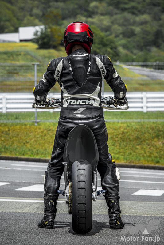 サスペンションセッティングがオフロードのままだったこともあり、姿勢変化が大きく、少しハードにコーナーへ進入しようとするとリアタイヤの荷重が減少してスネーキングが発生してしまった。これはオンロード向けのセットアップをすることで対応できるだろうし、左手のブレーキ操作と回生ブレーキの利き方に慣れたら進入でのスライドにつなげていけるのかもしれない。