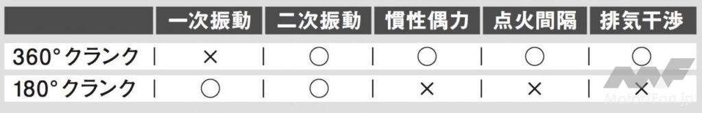 360°クランクでは等間隔の燃焼のため点火間隔による不整振動はないが、単気筒と同様な上下の一次振動が出る。2輪車ではこの上下振動を緩和するためにクランクシャフトのバランスをオーバーバランスにして上下振動を減らし、左右振動に振り向ける。人間は上下振動をより不快に感じるのでこのような方策を用いる。