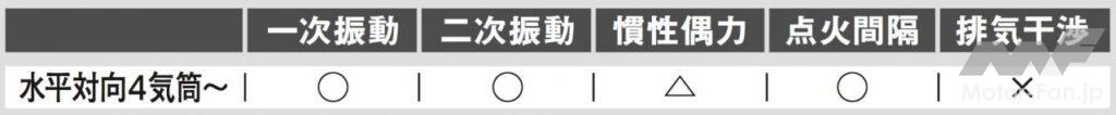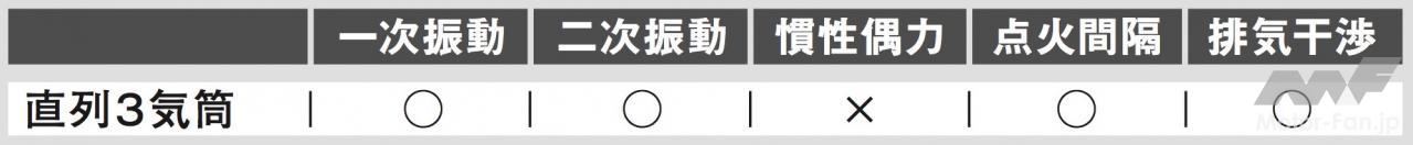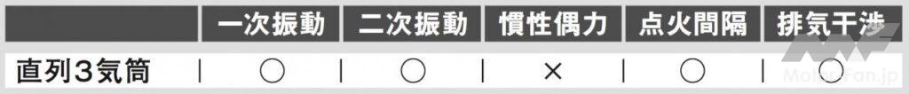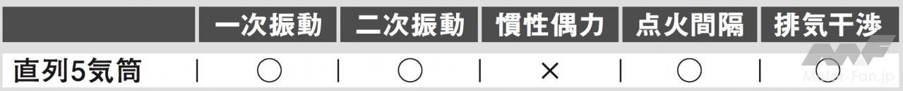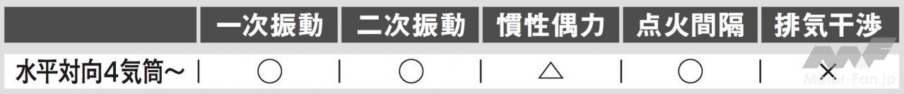 慣性力は一次、二次ともバランスしており問題ないが、ピッチングとヨーイングが連成した慣性偶力が残る。これが車両でのこもり音や音色悪化の要因となる。