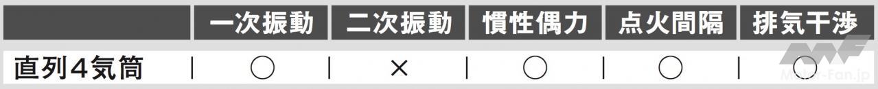 直列4気筒エンジンでは#1と#4のシリンダーが同時に上下運動し、#2と#3シリンダーは180°位相を変えて上下運動する。従って直列4気筒では一次振動は打ち消される。その一方でエンジン回転の2倍の速度で発生する二次慣性力は4気筒とも同方向(ピストンが上下運動する方向)に働くので、この力が加振力となってエンジンを上下に激しく振動させる。