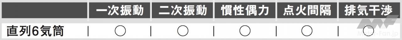 完全バランスと言われている気筒配列が直列6気筒である。慣性力、慣性偶力ともにバランスしている。他のマルチシリンダー、例えば60°V6では二次慣性偶力が残 り、90°V8でも二次慣性偶力が残るので振動特性としては完璧と言うことができる。厳密に言えば3次のローリング偶力がわずかに残るが、これは無視できるレベルである。