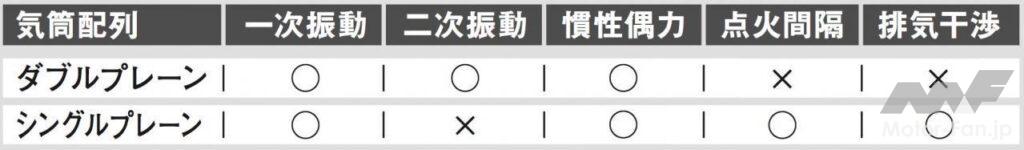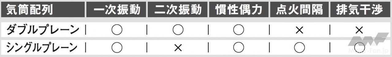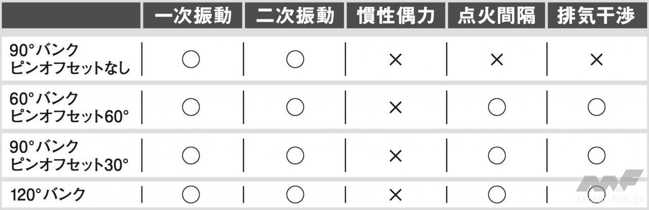 右バンクでは270°-180°-90°、左バンクでは90°-180°-270°の不等間隔点火であることがわかる。通常、排気管は各バンク毎にまとめられるので、当然ながら排気効率も等間隔燃焼よりも悪くなる。主運動系の慣性力、慣性偶力は一次、二次ともバランスしており問題ない。