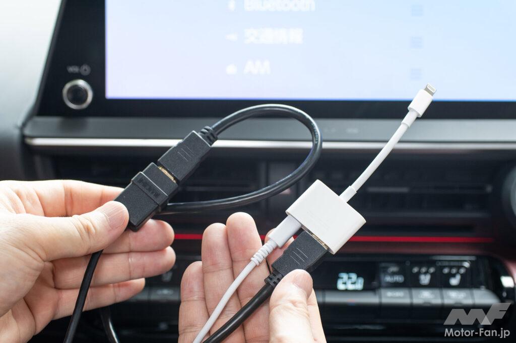 インパネのイメージはノーマルと変わらず、テレビキットの小さなON/OFFスイッチがステアリングまわりに装着されるのみ。HDMI変換ケーブルはダッシュボードの裏から引き回されており、iPhoneの場合にはアップル純正の「Lightning-Digital AVアダプタ」を介して接続する。純正品以外の互換AVアダプタを用いた場合は映像が映らない場合がある(純正カーナビが1080pに対応していないため)ので注意が必要だ。また、Androidスマホは「Alternate Mode」に対応している機種のみ映像出力が可能だという。