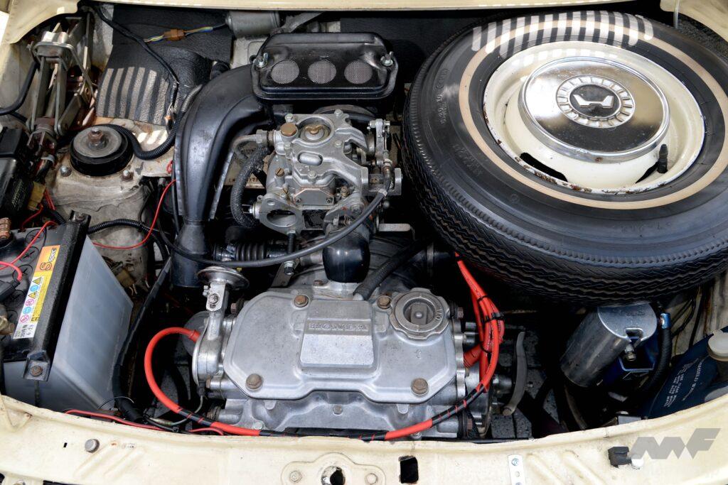 圧巻なのはパワートレーン。エンジンは大幅なパワーアップが可能なよう内部をチューニングしてあり、吸気系には旧ミニと同じ手法でウエーバーキャブレターをセットしている。高性能キャブの代名詞であるウエーバーキャブレターは2本の吸気管に対応するツインチョーク式。4気筒なら2個、6気筒なら3個を使ってセッティングするものだが、N360は2気筒とはいえ吸気管は1本しかない(Tシリーズは2連キャブ仕様で2本ある)。そこでウエーバーの片側を塞いでシングル仕様にして使うスプリット・ウエーバーとしているのだ。