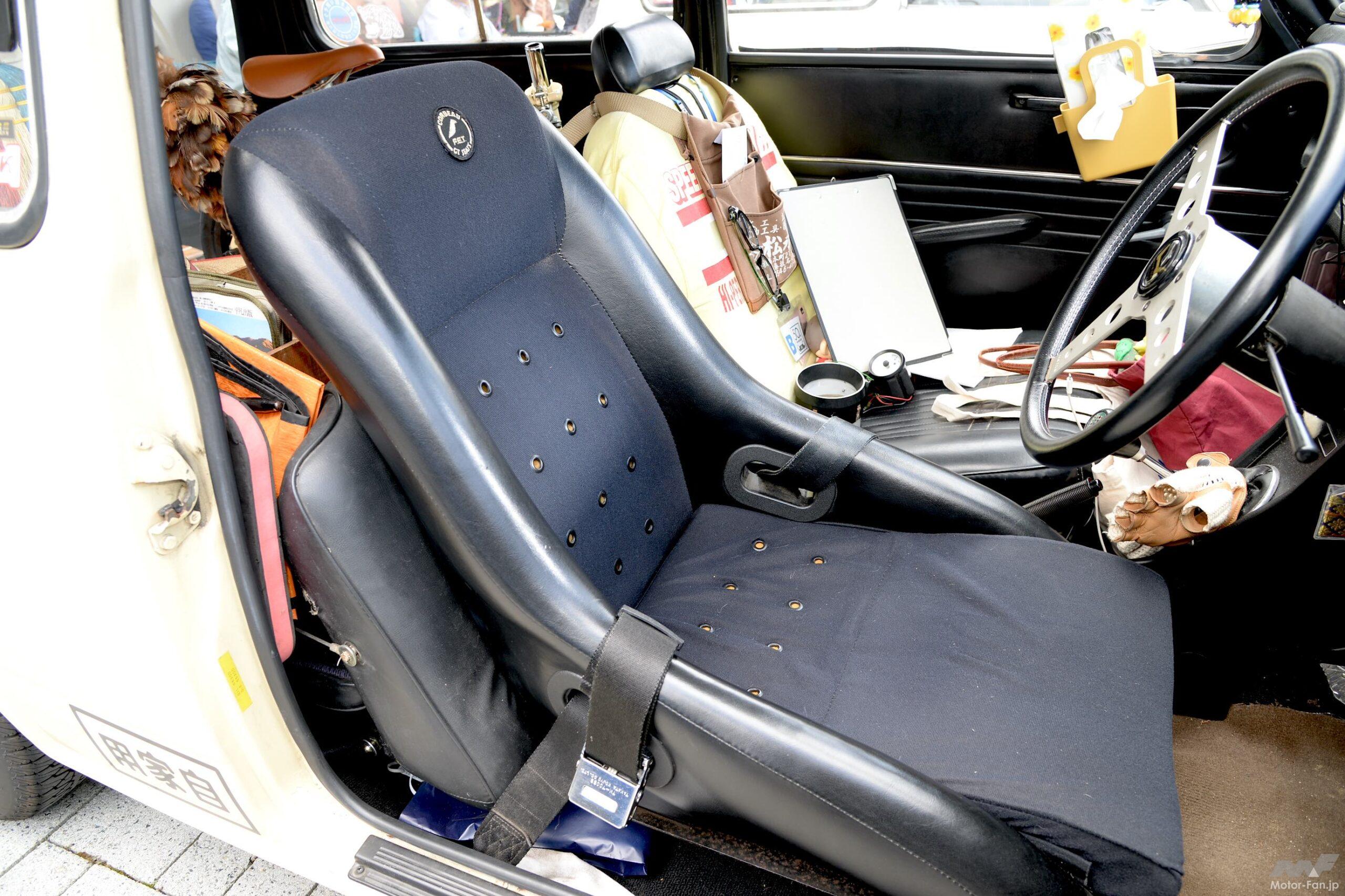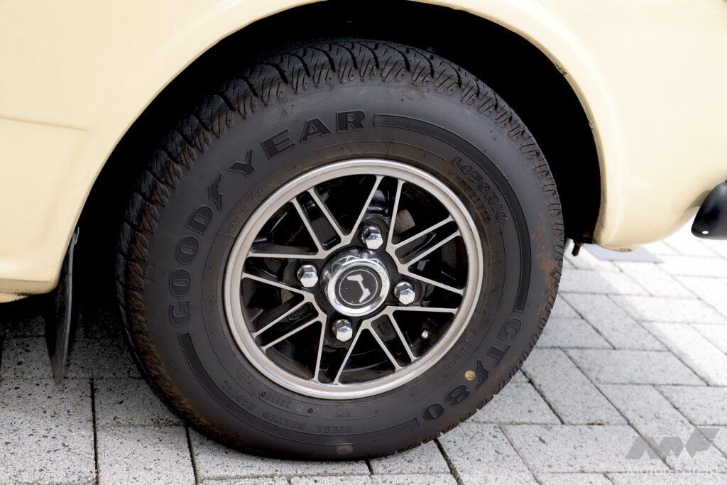 ハイパワー化しているので足回りも純正ではない。ストラット方式のフロントは強化コイルとダンパーが今でも手に入る。難しいのはリーフスプリングによる固定軸であるリヤで、植原さんはセダン用とバン用の板バネを組み合わせて硬いだけでなくしなやかに動く足回りを実現させた。さらに足元にはスピードスターホイールを履かせ、フロントはハブごとZ GS用ディスクブレーキを移植している。やれることは全てやってあると言っていい強烈なLN360なのだった。