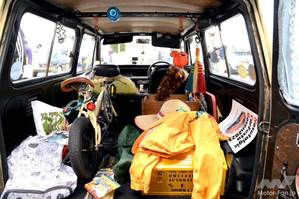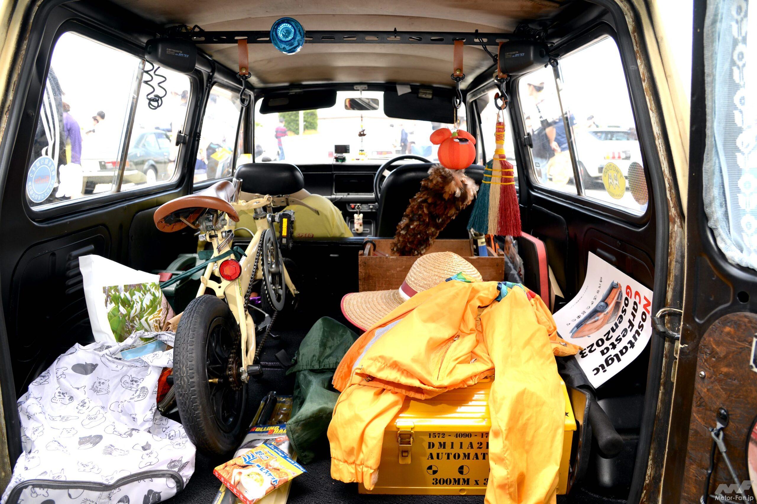 以前に乗っていたミニでカスタムやチューニングを楽しんでいた植原さんだから、LNでも自分好みの仕様へモディファイを開始する。ルーフにミニ風の大型キャリアを装着したり、網目模様のライトガードや大型フォグランプで英国車風のルックスに仕立てた。室内では運転席だけフルバケットシートに変更したほか、乗用車のツーリングS用センターコンソールを移植してスポーティに演出。さらに広いラゲッジでは天井にラックをつけてスピーカーやフックを吊り下げ、横開きドアの内側には荷物が当たっても傷がつかないよう塗装したコンパネを貼るなど工夫して楽しんでいる。