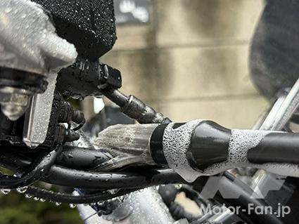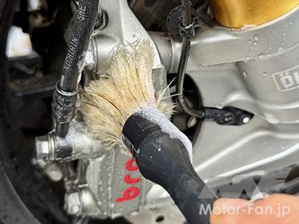 筆型ブラシだが、塗装やメッキ部分は柔らかめのブラシ、それ以外は硬めを使う。ネジの頭は、硬めブラシで突くように当てると汚れが落ちやすくなる。ホース類は、中央部は柔らかめブラシで線をなぞるように撫で、付け根部分は硬めで突くように洗っていこう。洗う箇所によって、ブラシの硬さを変えてやるのがコツだ。加えて、洗ったらすぐに水で洗い流すのも大切だ。